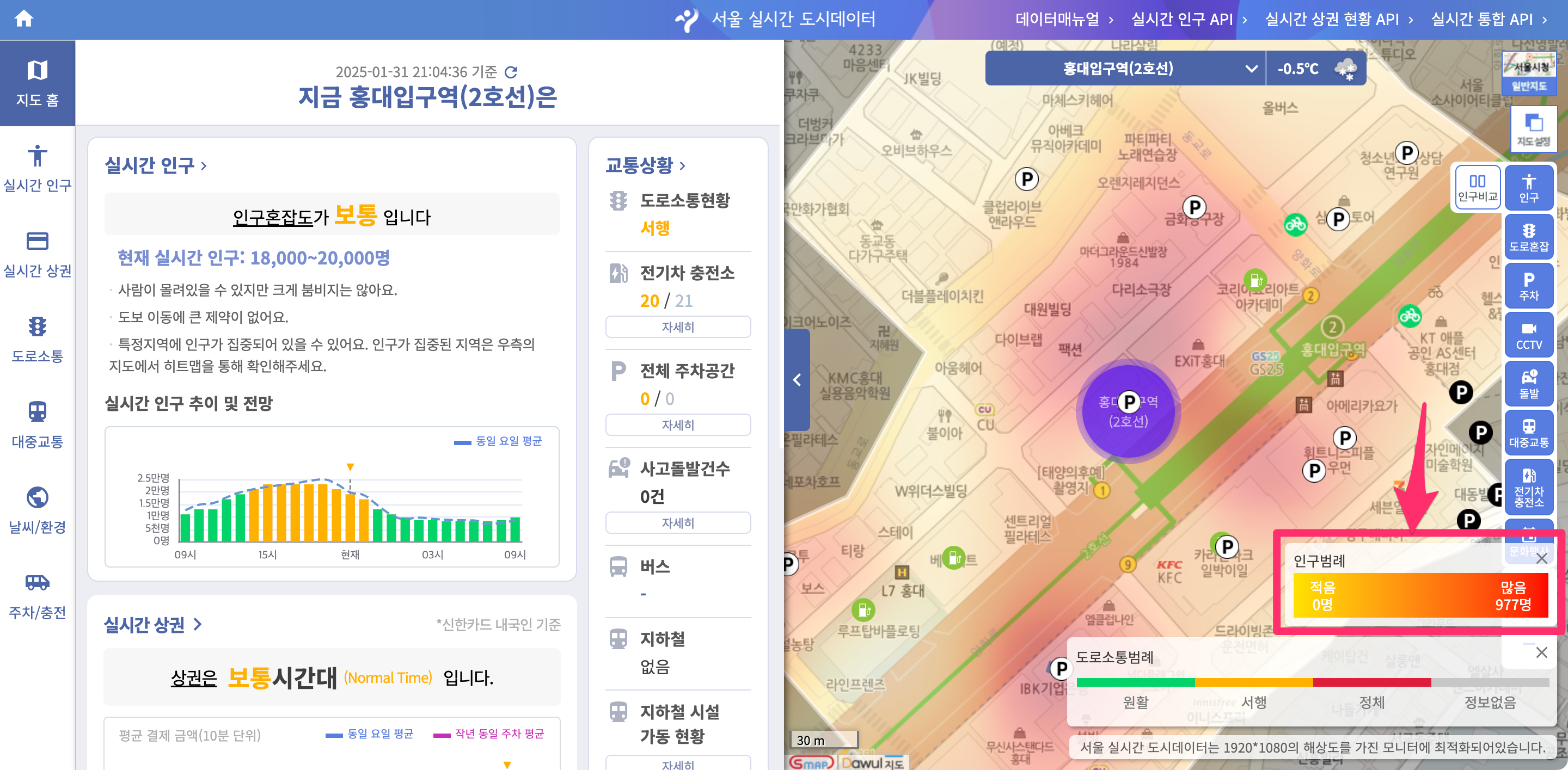 실시간 인구뿐만 아니라 상권, 도로, 교통 등 다양한 실시간 정보를 제공하고 있습니다.