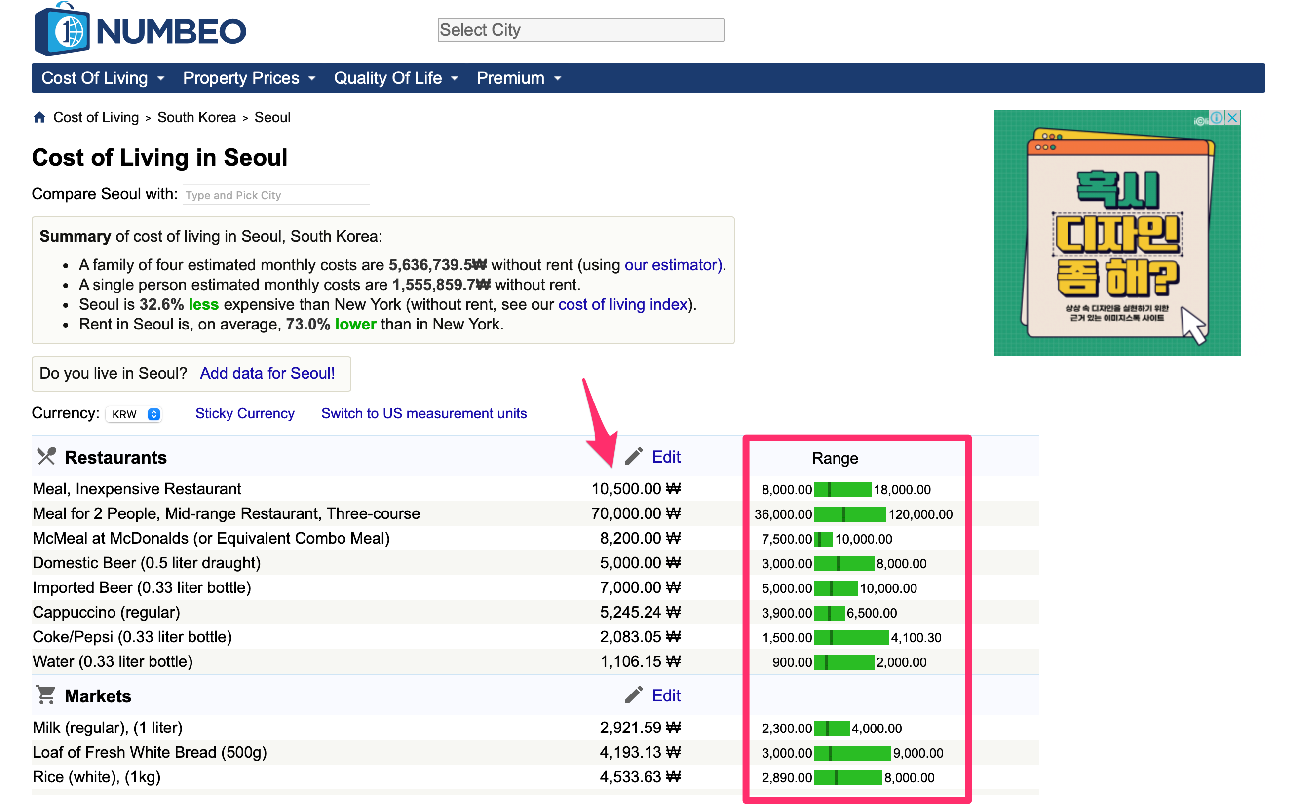 옆에 Range는 세계 물가 범위이고 녹색바 왼쪽 숫자는 최소값, 오른쪽 숫자는 최대값입니다.