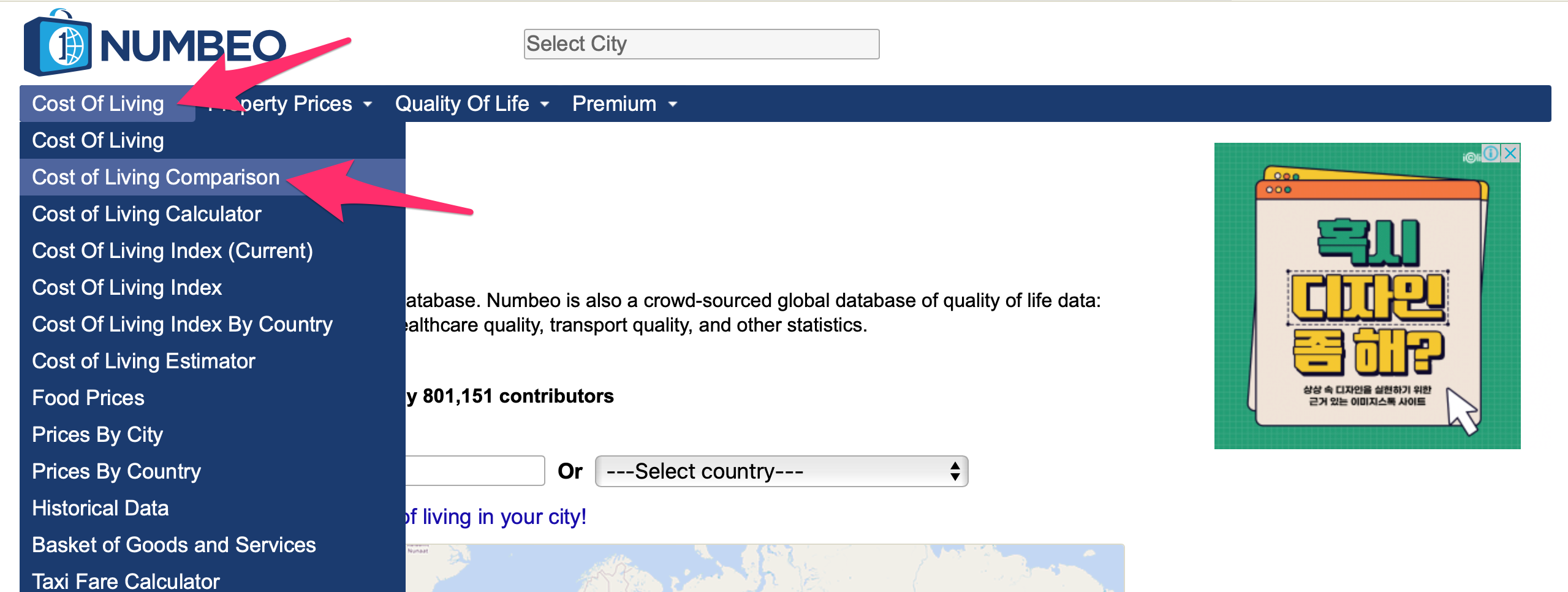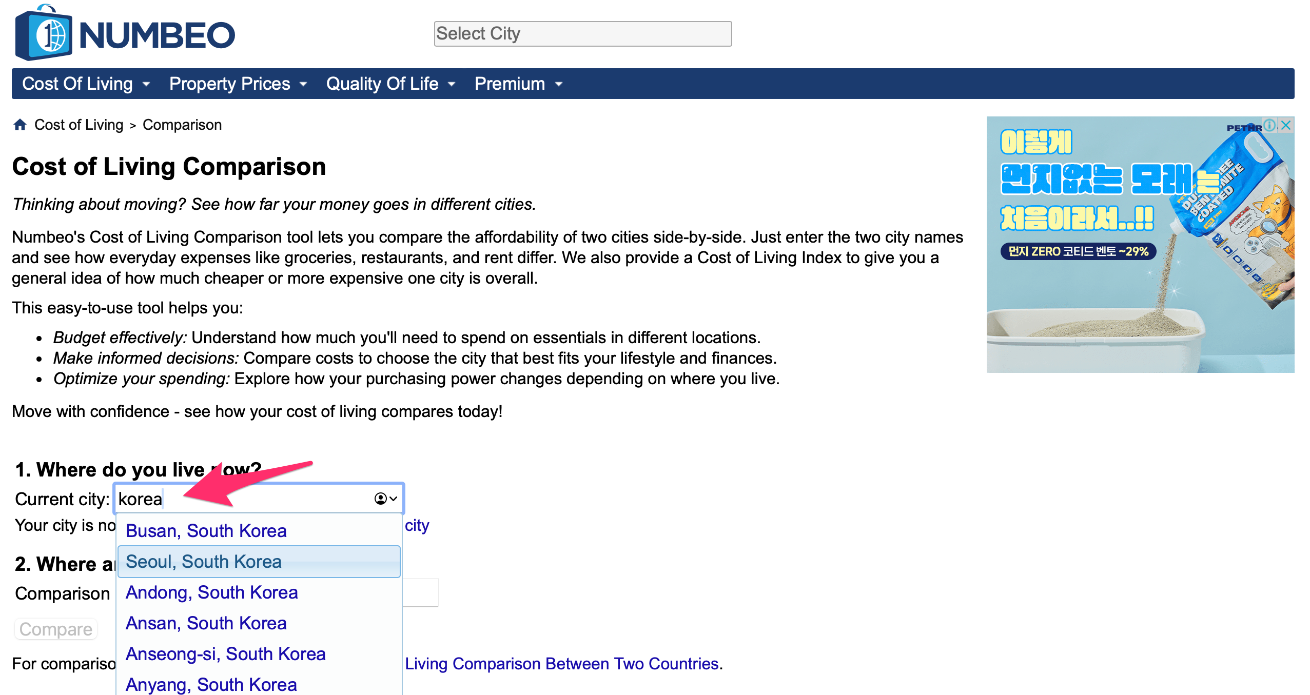 상단 Cost Of Living 메뉴에서 Cost of Living Comparison를 선택합니다.
