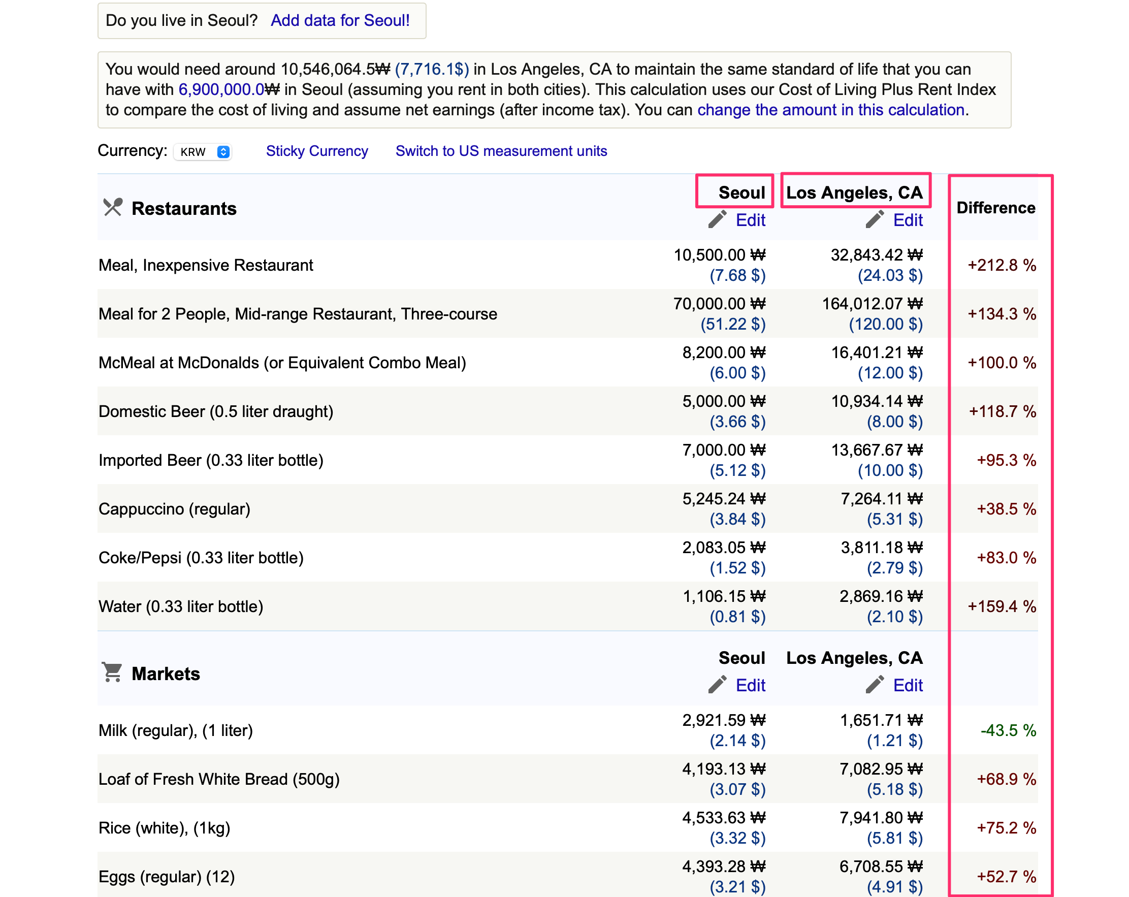 이제 Seoul과 Los Angeles의 물가를 비교하시면 됩니다.