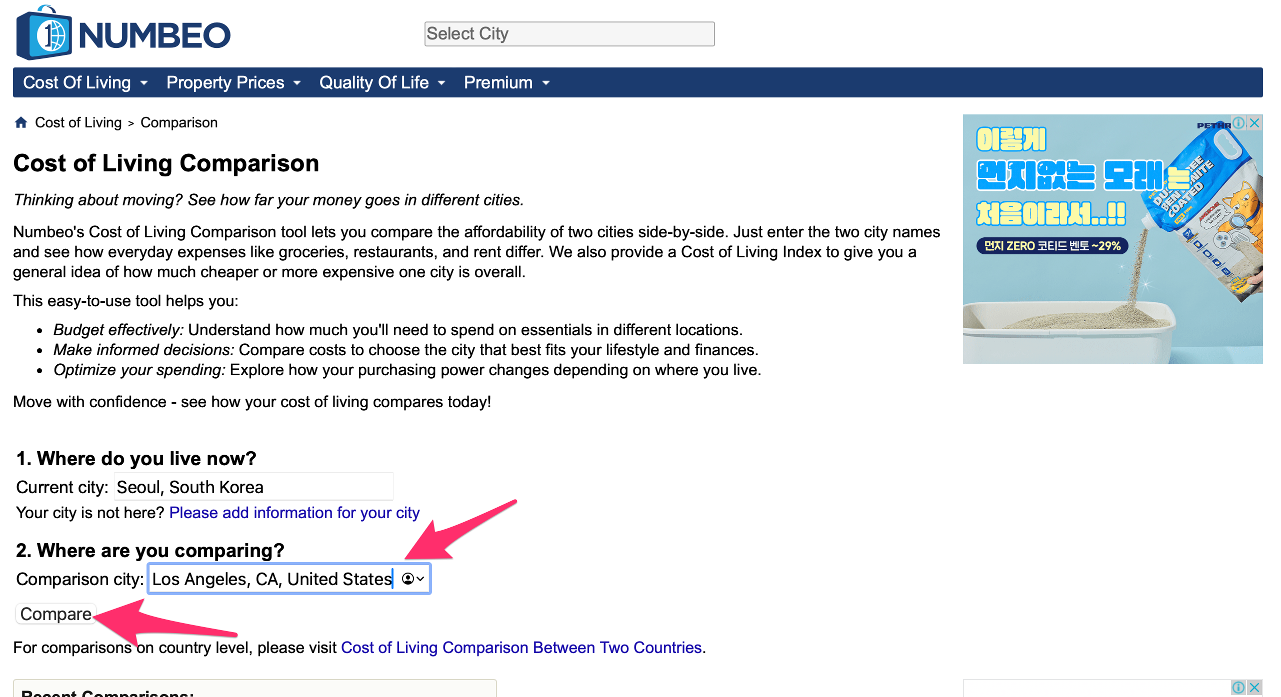 Where are you comparing? 의 Comparison city에서 Los Angeles를 선택했습니다.