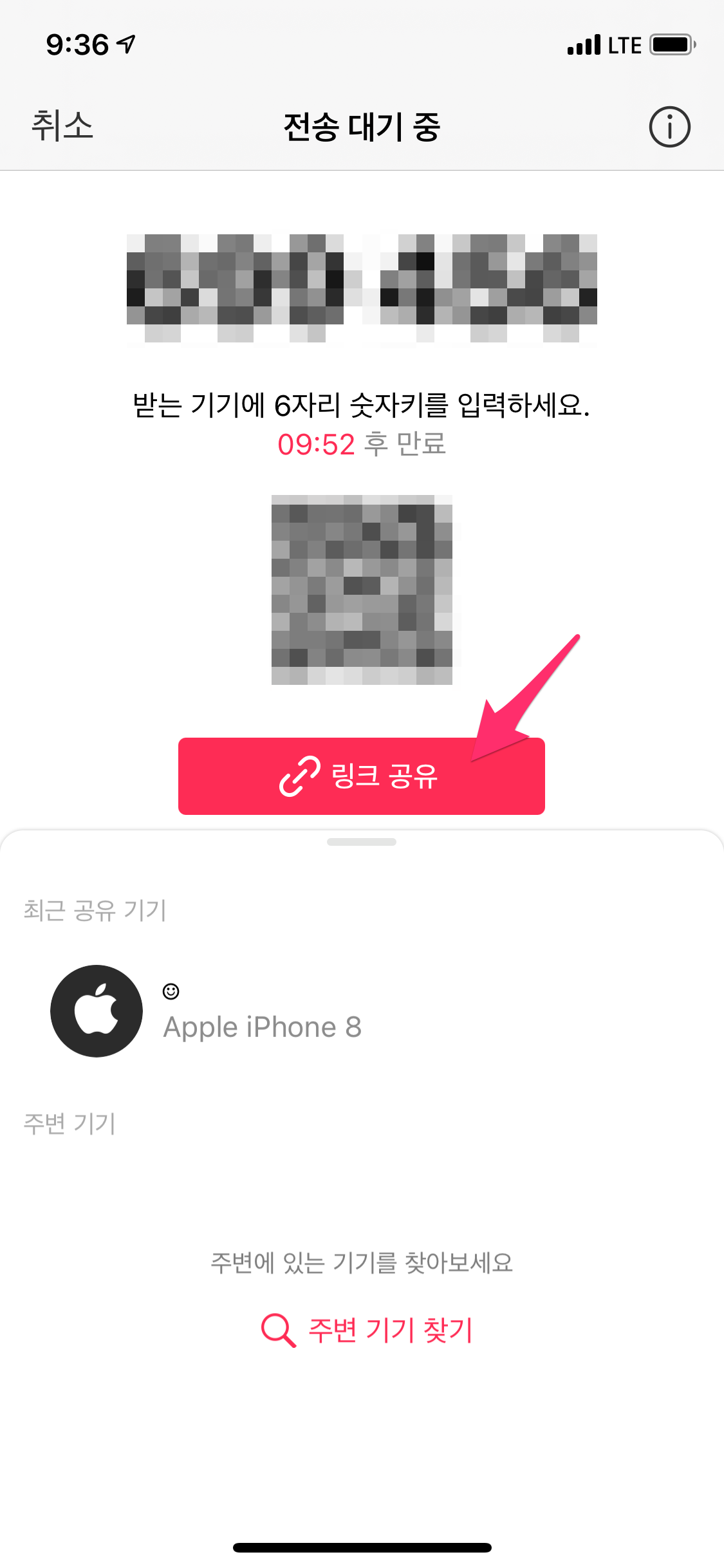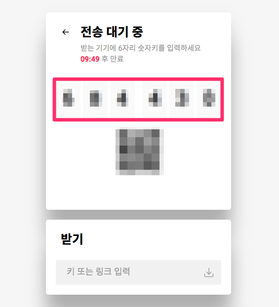 전송 화면이 나오면서 상단에는 6자리 숫자키 중간에는 QR 코드 보이고 10분 안에 숫자키나 QR코드를 보내줘야 합니다.