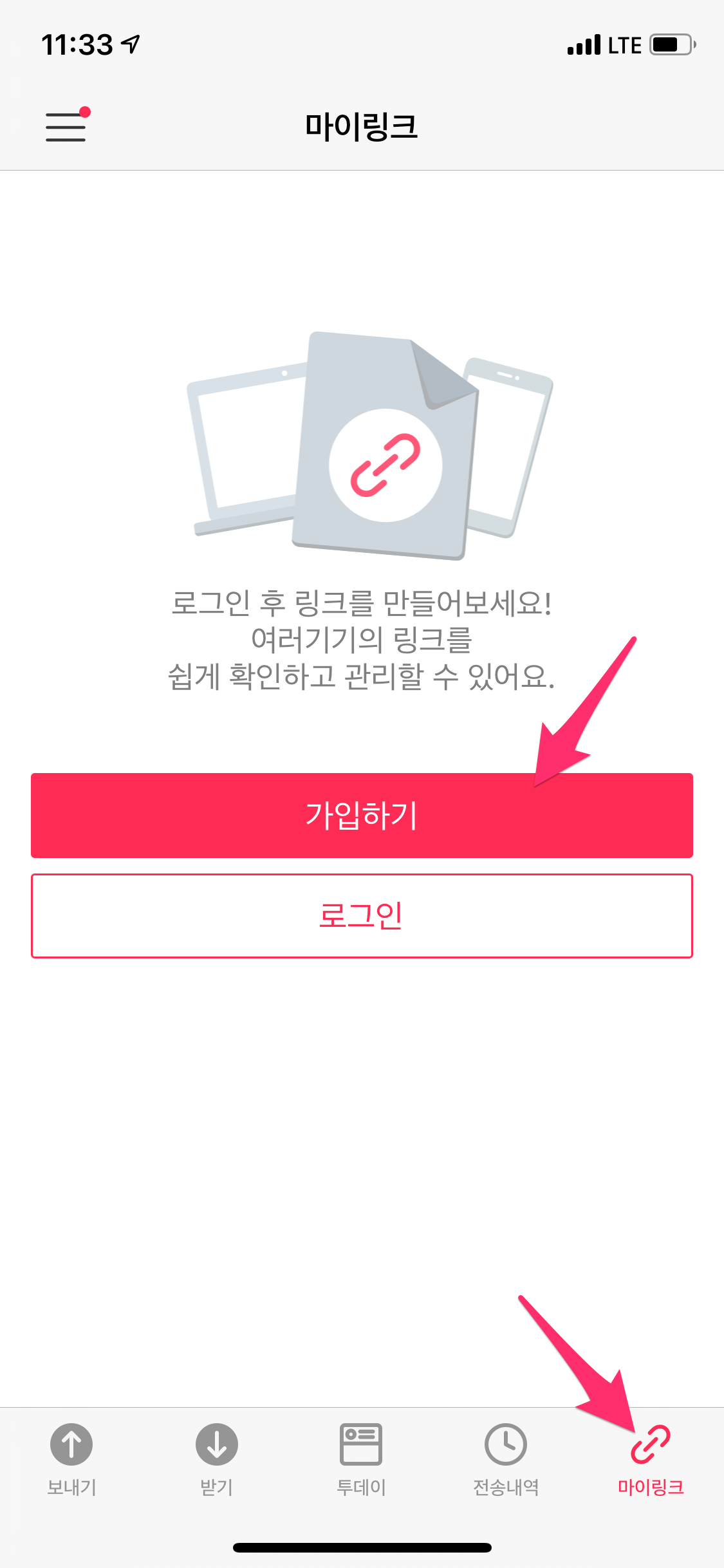 링크 공유하거나 마이링크 메뉴를 이용하려면 로그인이 필요 메뉴이기에 센드애니웨어에 회원 가입해야 합니다.