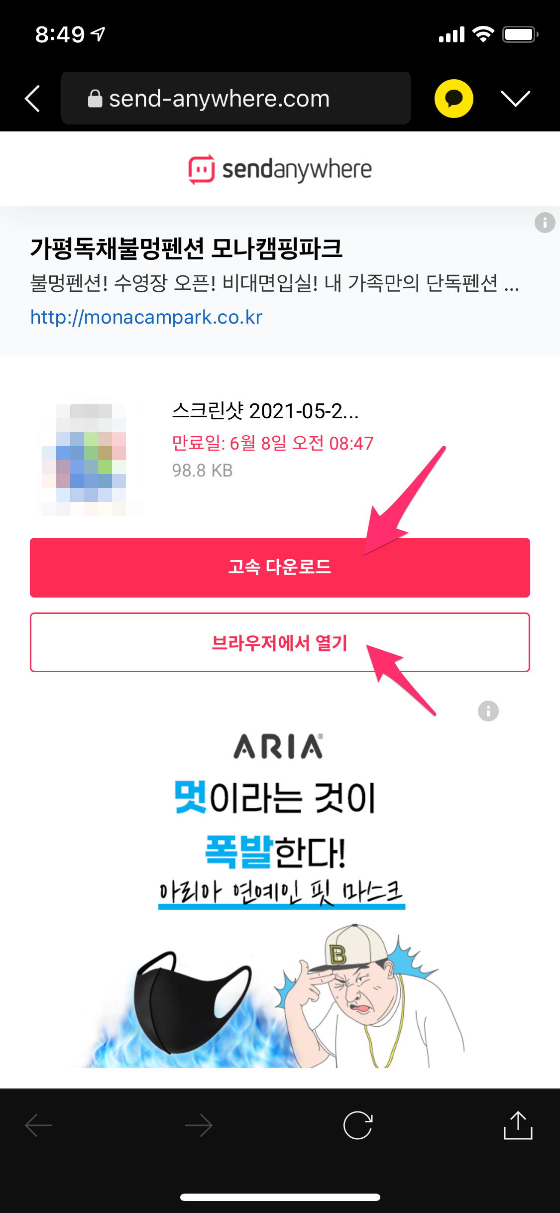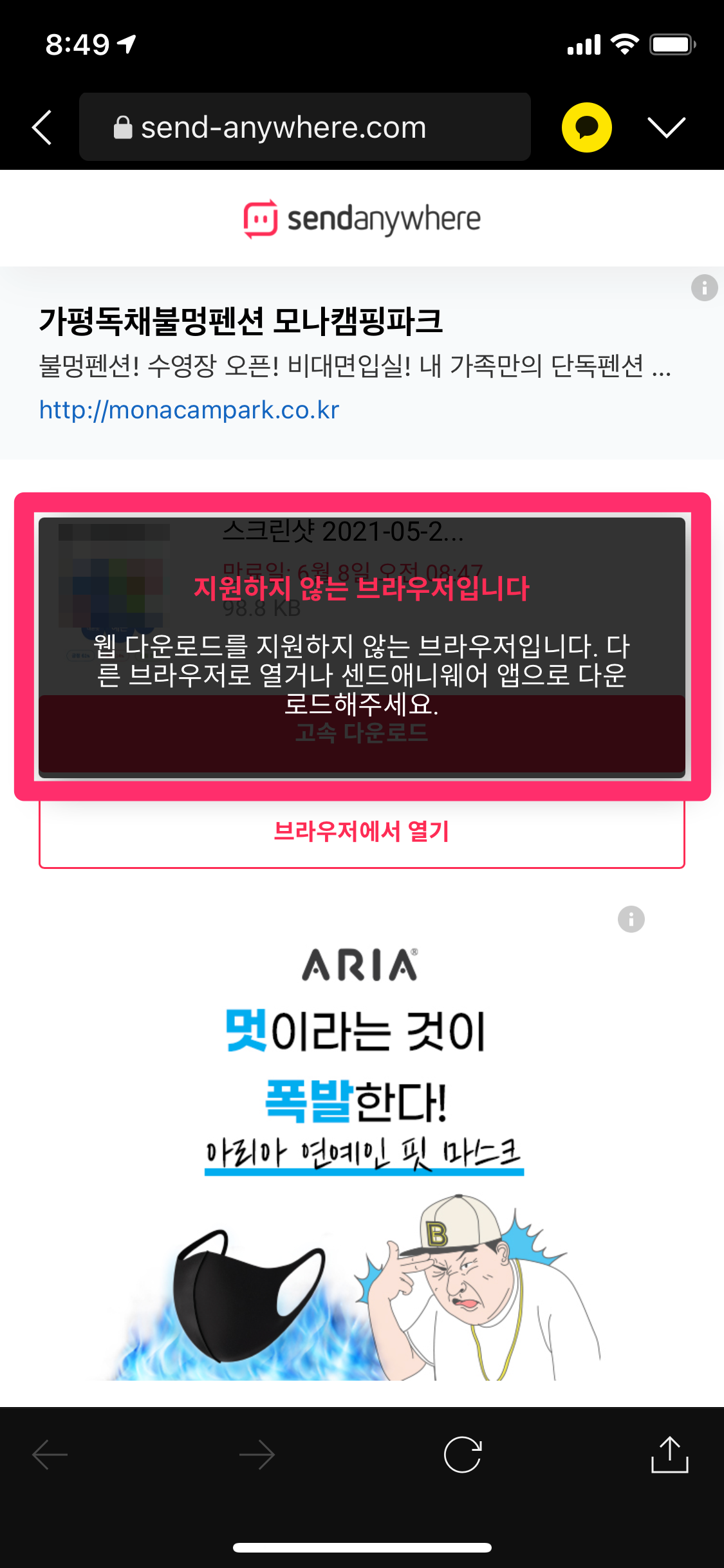 다만, 브라우저에서 열기를 이용하면 브라우저 호환을 체크하기 때문에 이왕이면 센드애니웨어앱을 설치 후에 고속 다운로드 선택하면 쉽게 다운로드됩니다.