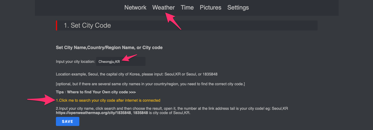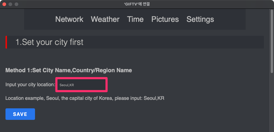 Input your city location에 Cheongju,KR를 입력한 후에 SAVE 버튼을 누릅니다.