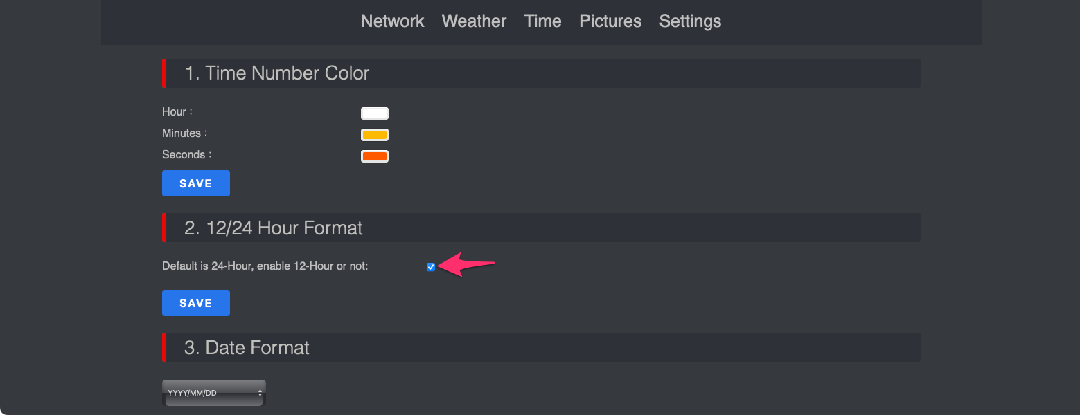또한 상단 Time 메뉴를 선택하고 시간 색상이나 12/24 시간을 선택할 수 있습니다.