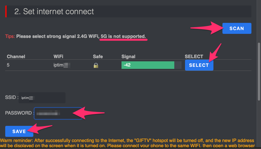 Set internet connect에서는 지금 사용 중인 WiFi를 SCAN한 다음에 WiFi 이름을 SELECT 하고 PASSWORD를 입력하고 SAVE 합니다. 다만, WiFi 5G는 지원이 안 되고 2.4G WiFi로 선택하시면 됩니다.