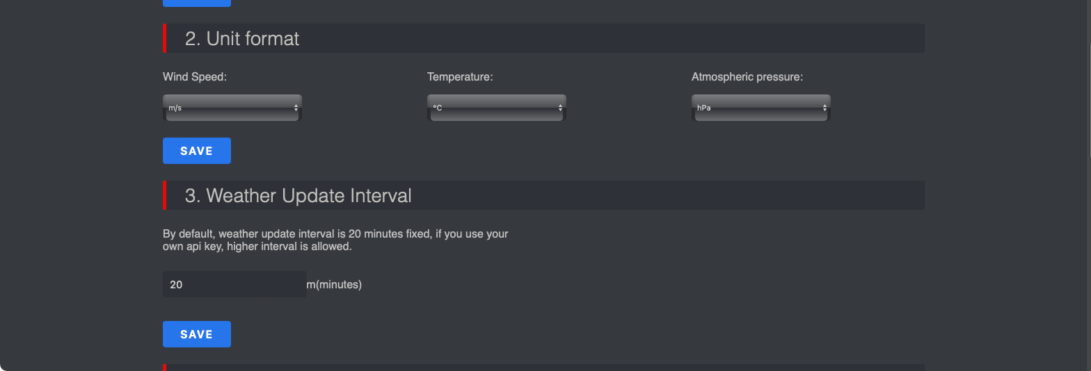 단위(Unit format)도 바람세기, 온도, 기압도 변경하고 날씨 업데이트 간격(Weather Update Interval)에서는 몇 분 간격으로 업데이트할지를 설정합니다.