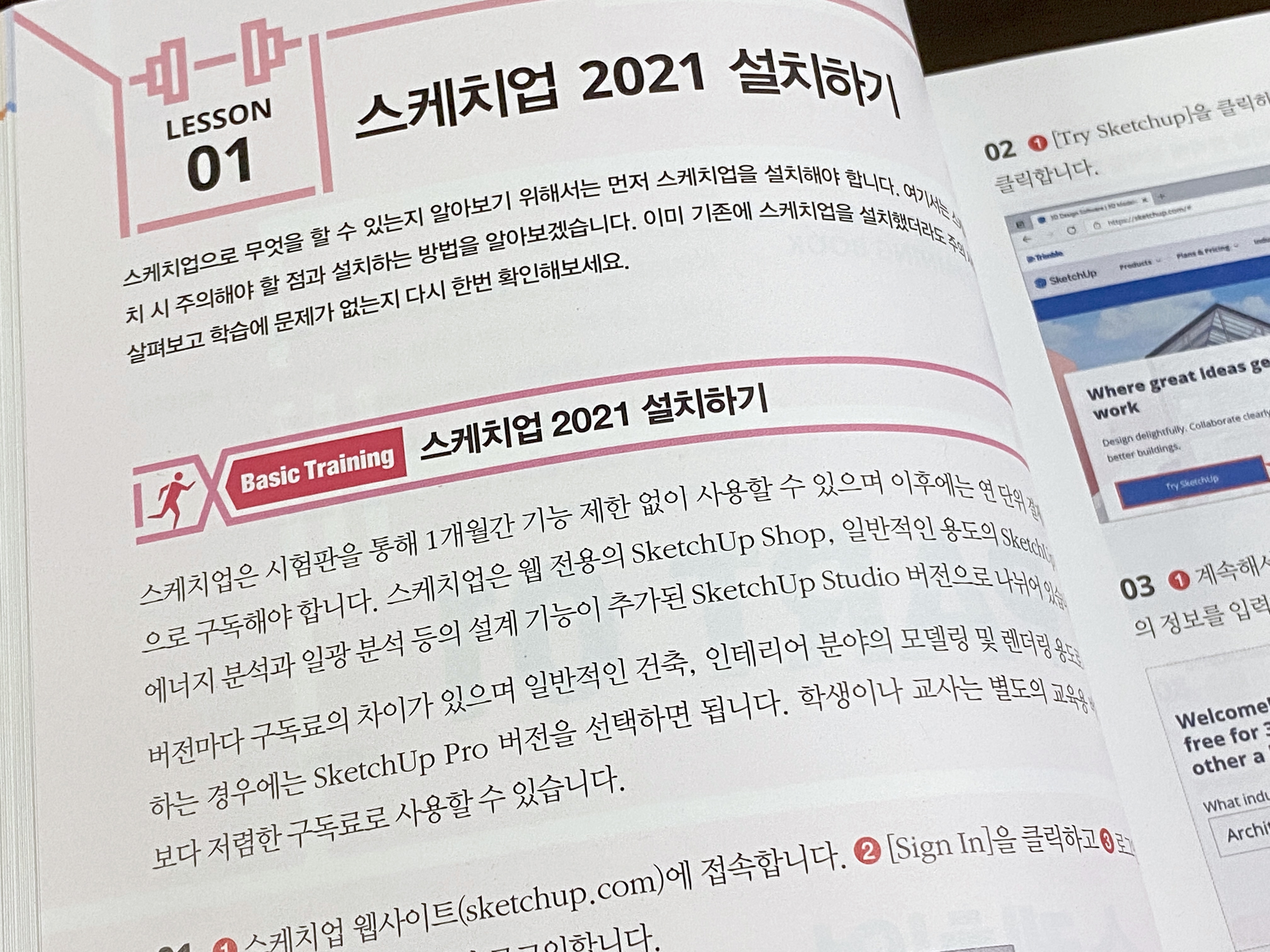 스케치업 최신 버전인 2021으로 공부할 수 있는 전면 개정판이라고 합니다.