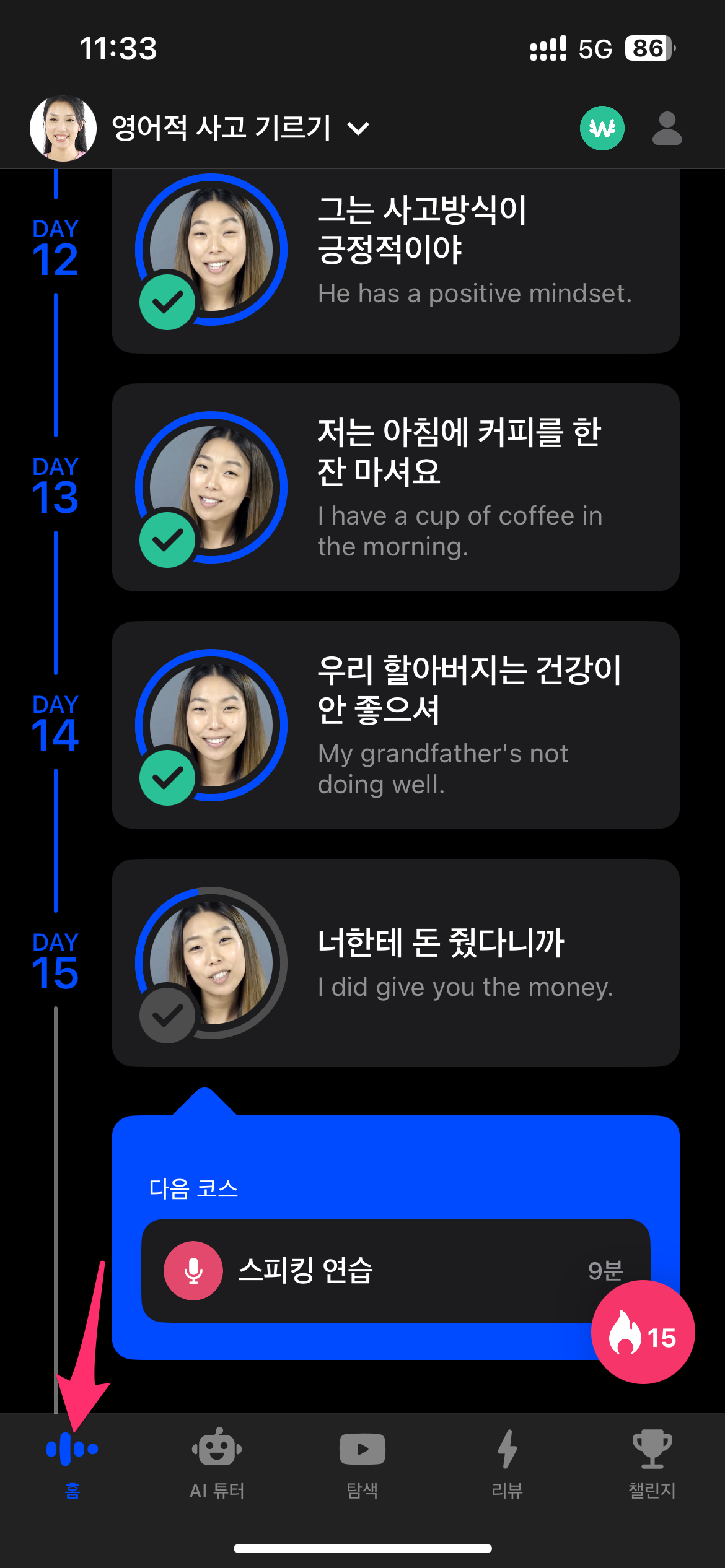 원하는 강의를 선택하면 오늘의 수업, 스피킹 연습, 실전 대화입니다.