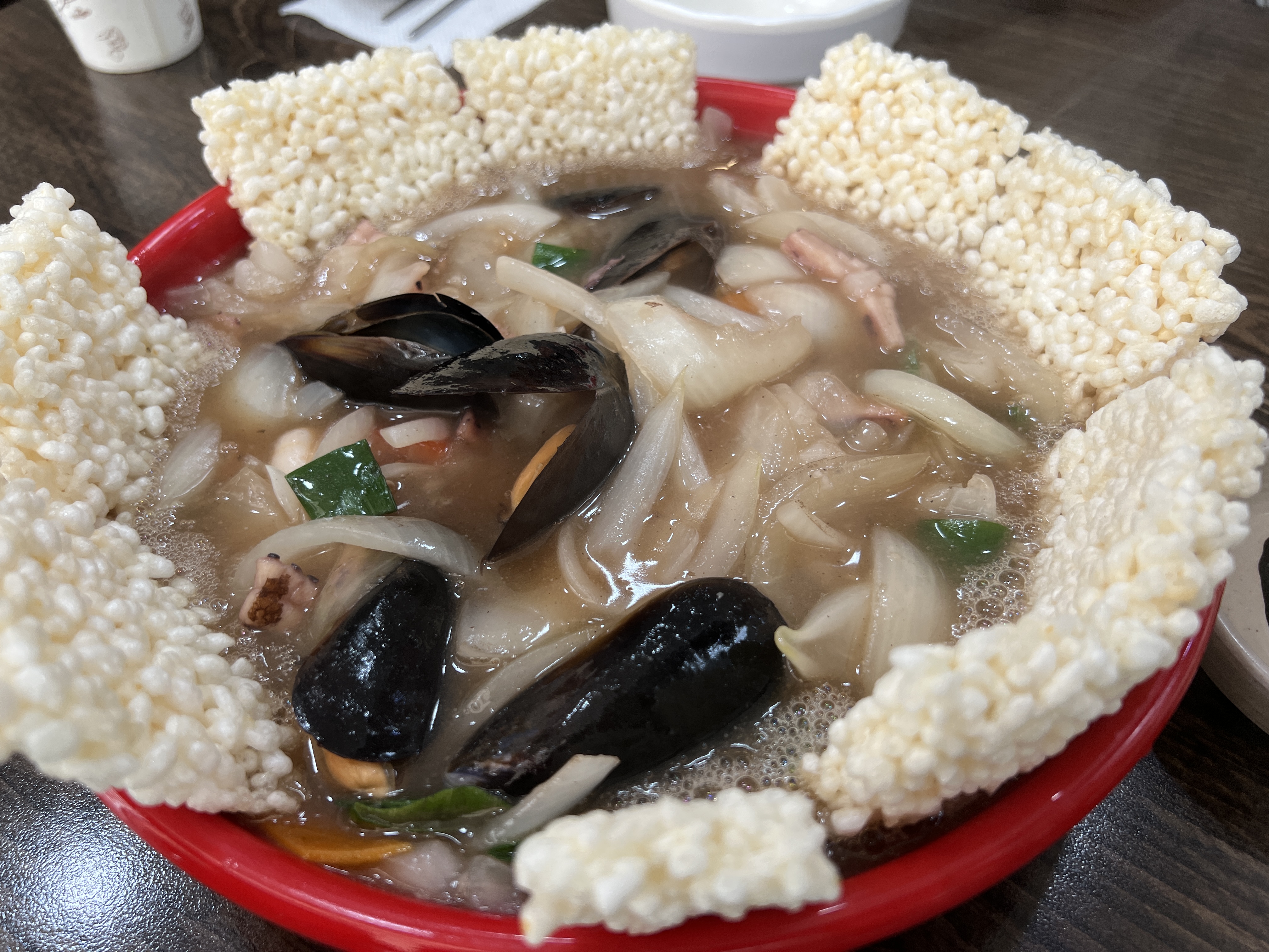 첫번째로 나오는 음식은 해물누룽지탕입니다.