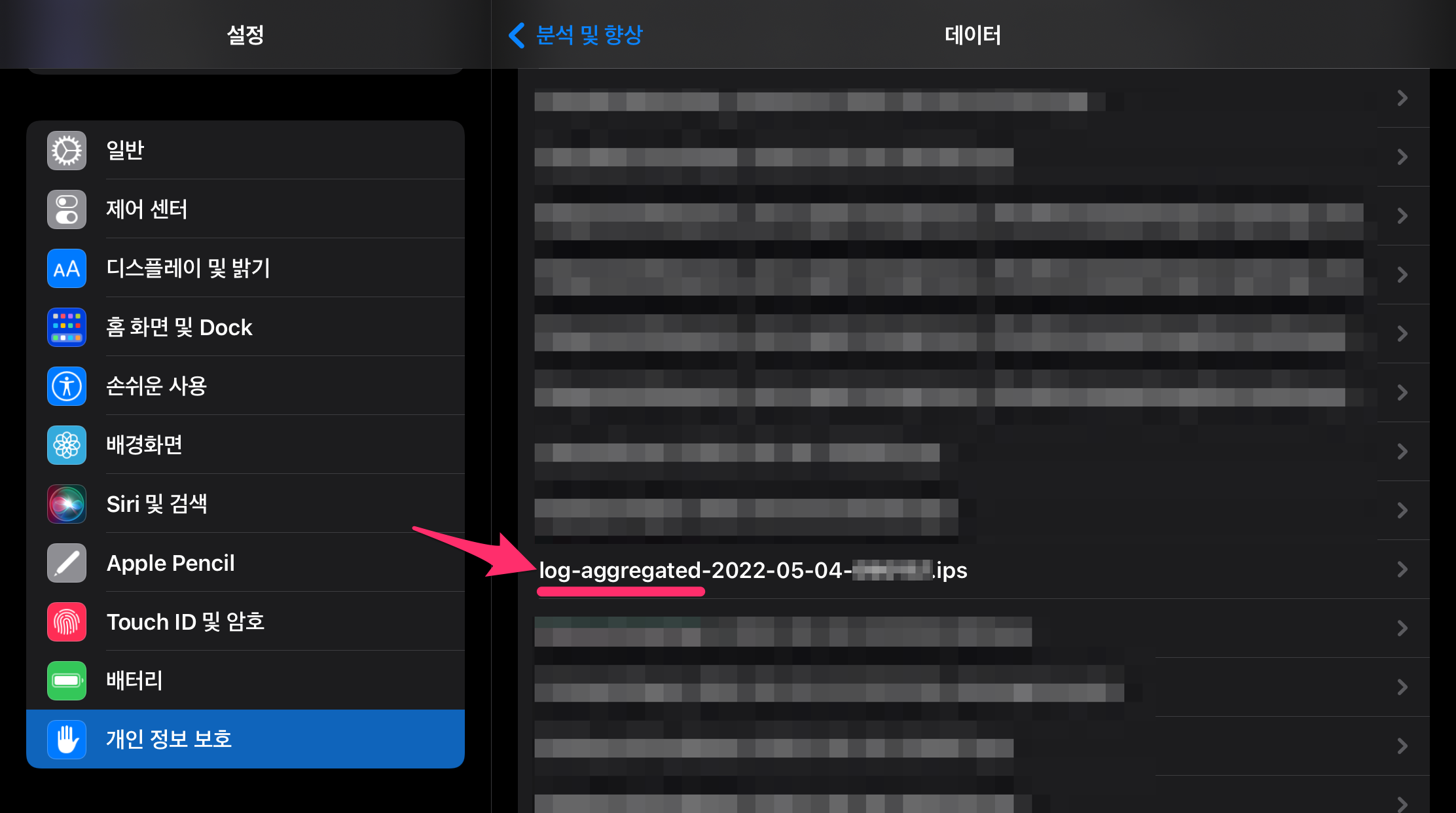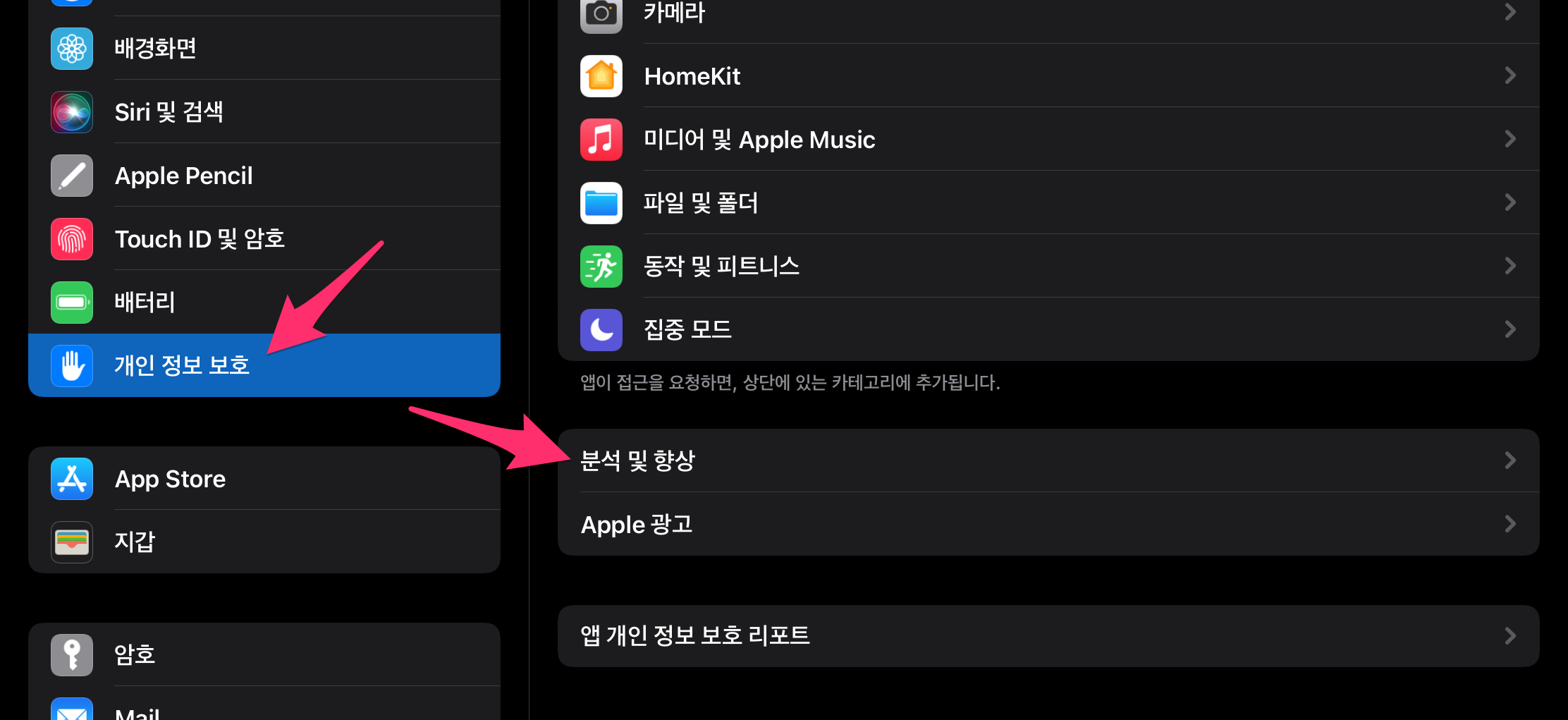 아이패드 설정에서 개인 정보 보호를 선택하고 하단에 분석 및 향상을 선택합니다.