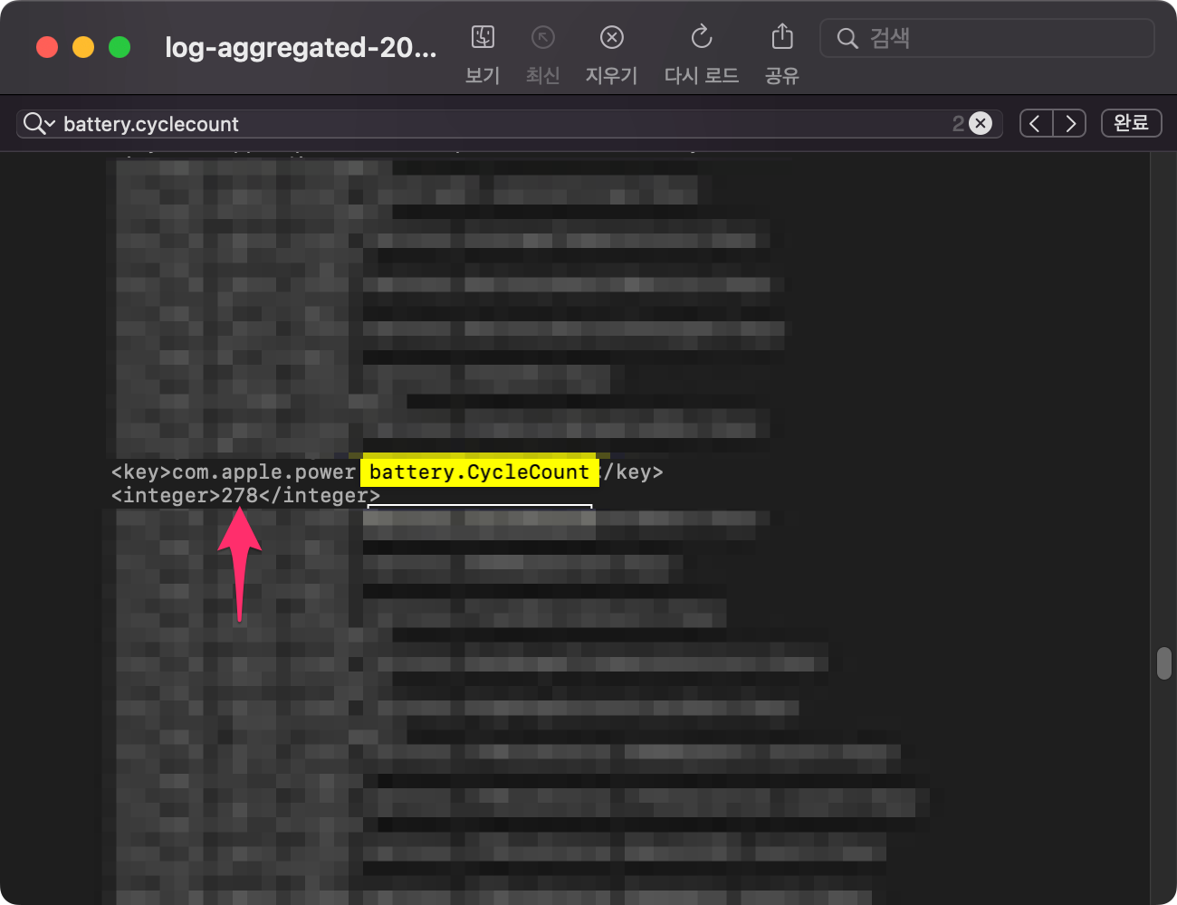 그리고 검색을 이용해서 battery.CycleCount 문구를 검색하시면 바로 아래 배터리 충전 수를 확인할 수 있습니다.
