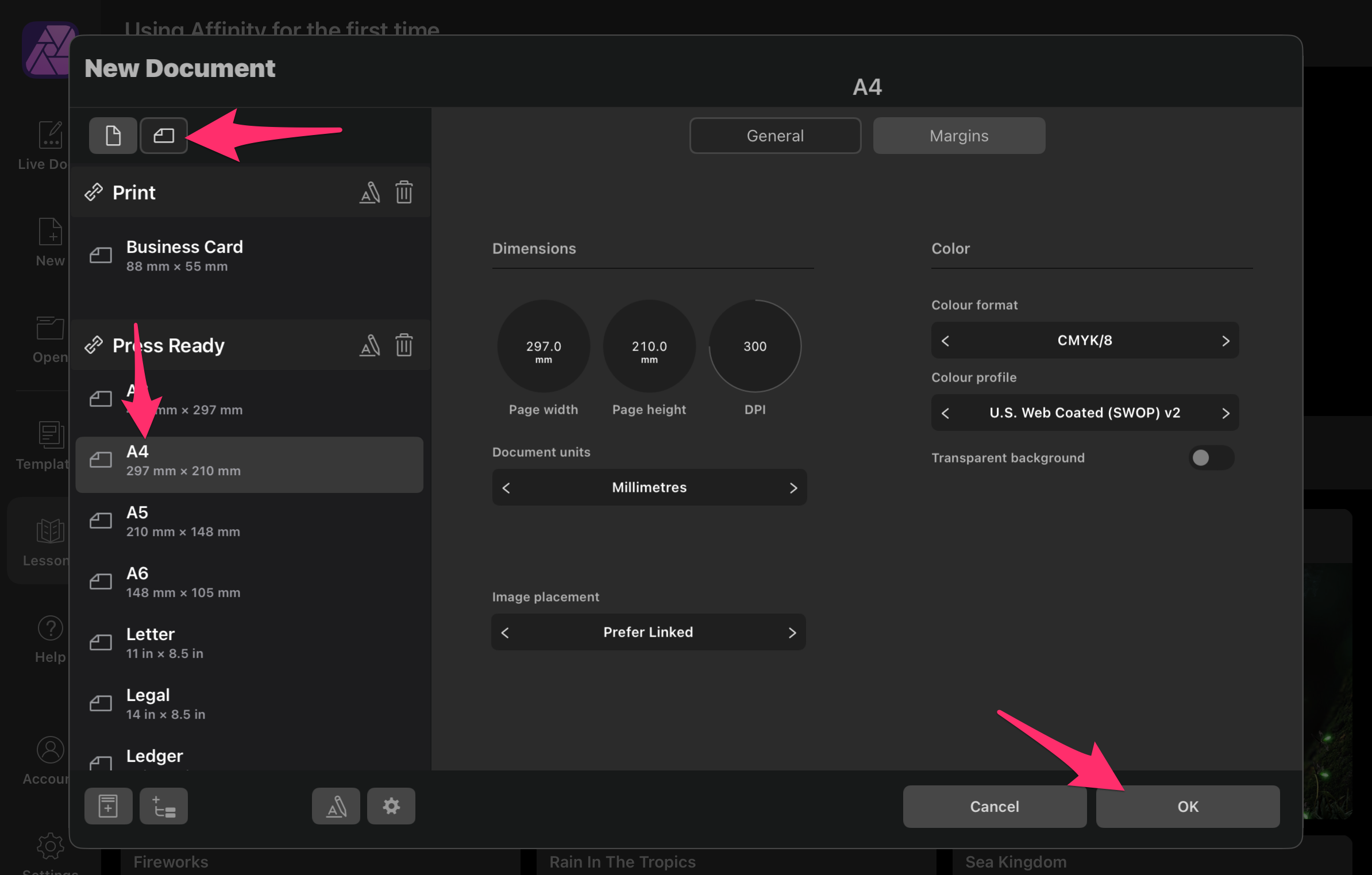 세로/가로 모드, 용지 사이즈, Color format을 선택한 후에 OK 버튼을 선택.