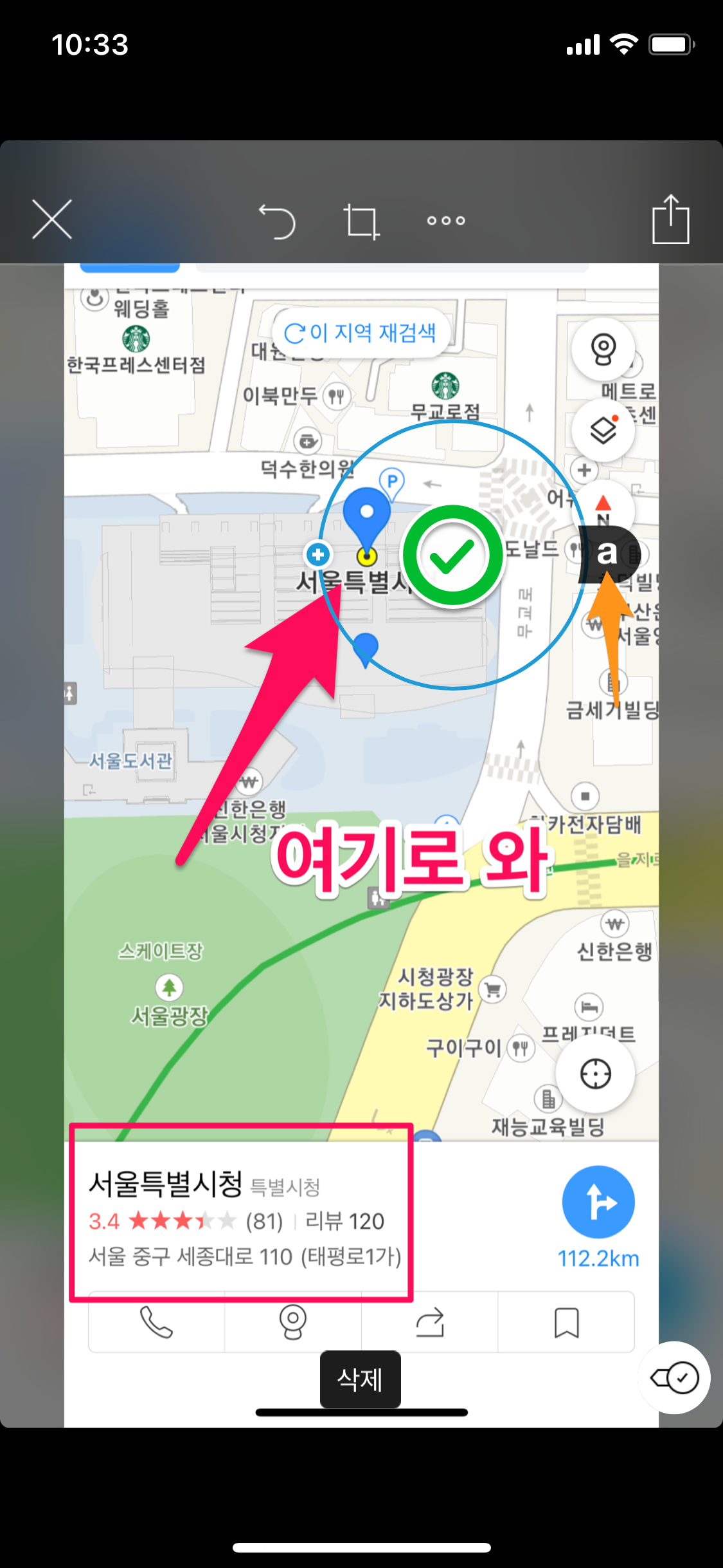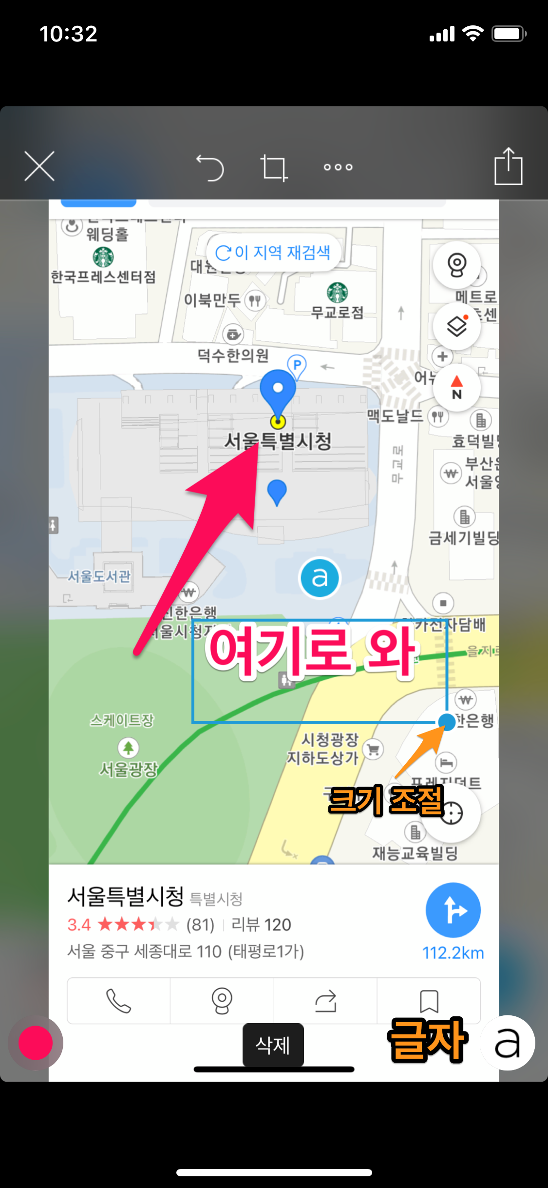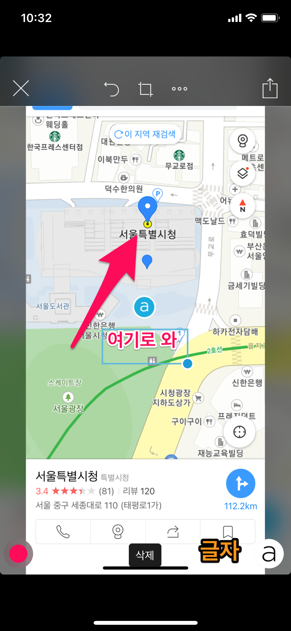 아... 그리고 그려진 화살표, 도형, 아이콘 등을 삭제하고 싶으시면 삭제하고 싶은 것을 선택하시면 하단 검은색 [삭제] 버튼이 보입니다.