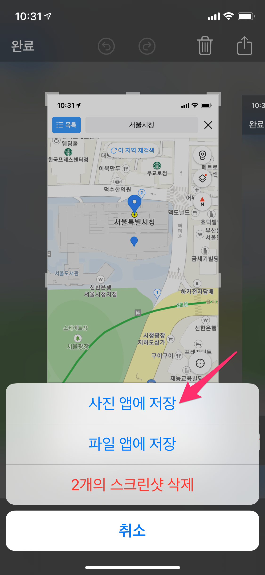 아이폰에서 캡처한 후에 왼쪽 상단 [완료]를 선택한 후에 [사진 앱에 저장]를 선택합니다.