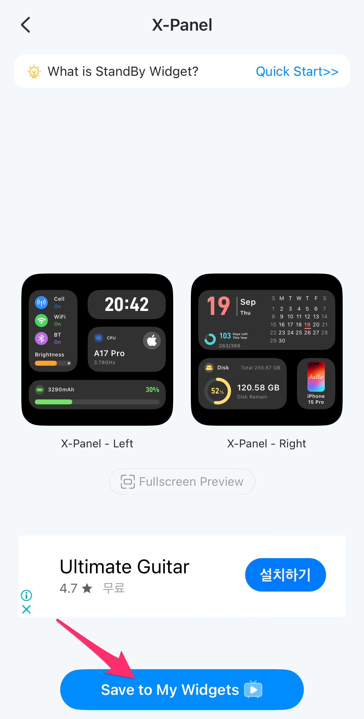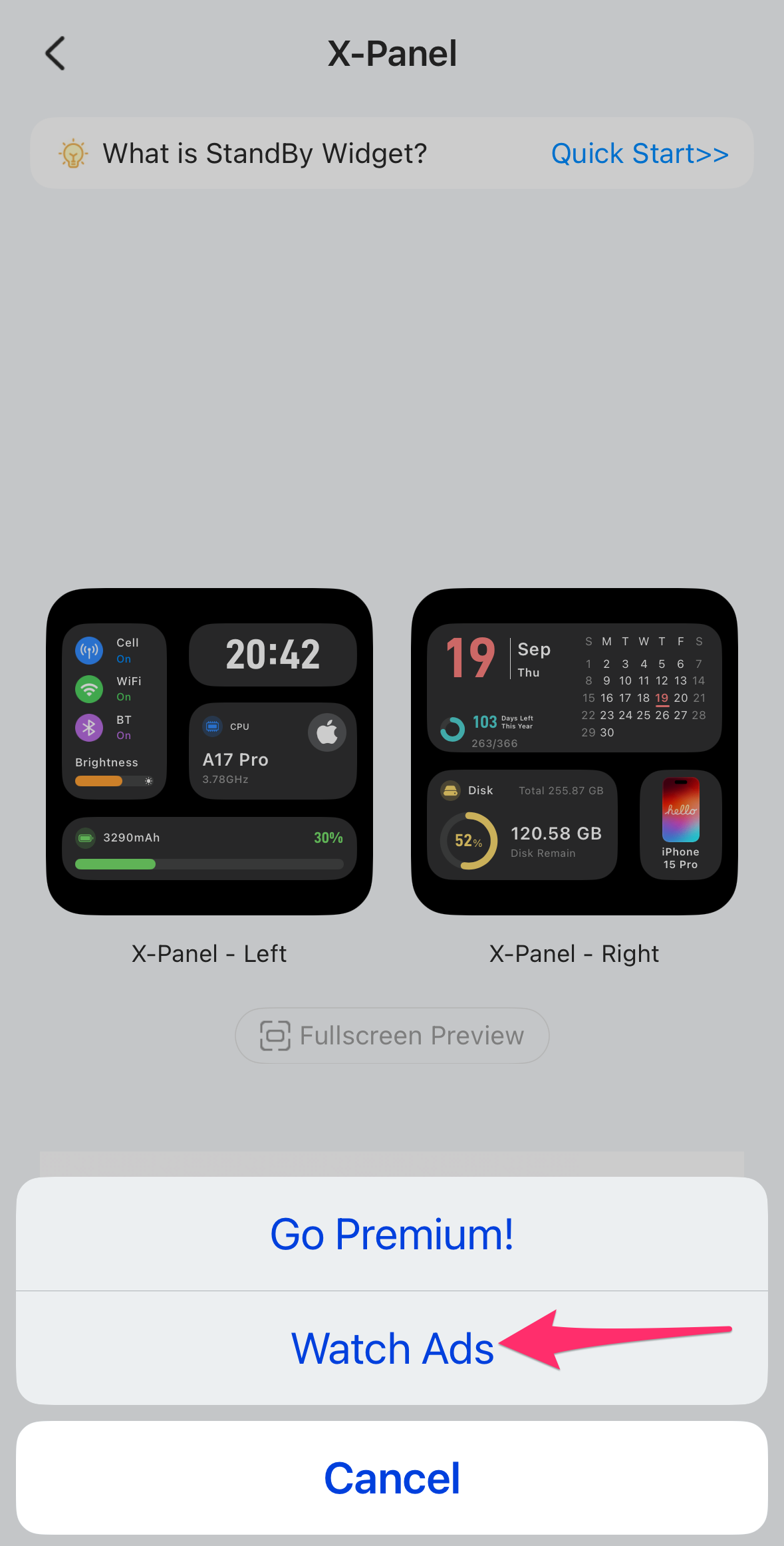 하단 Save to My Widgets 버튼을 누른 후에 Watch Ads를 선택합니다.