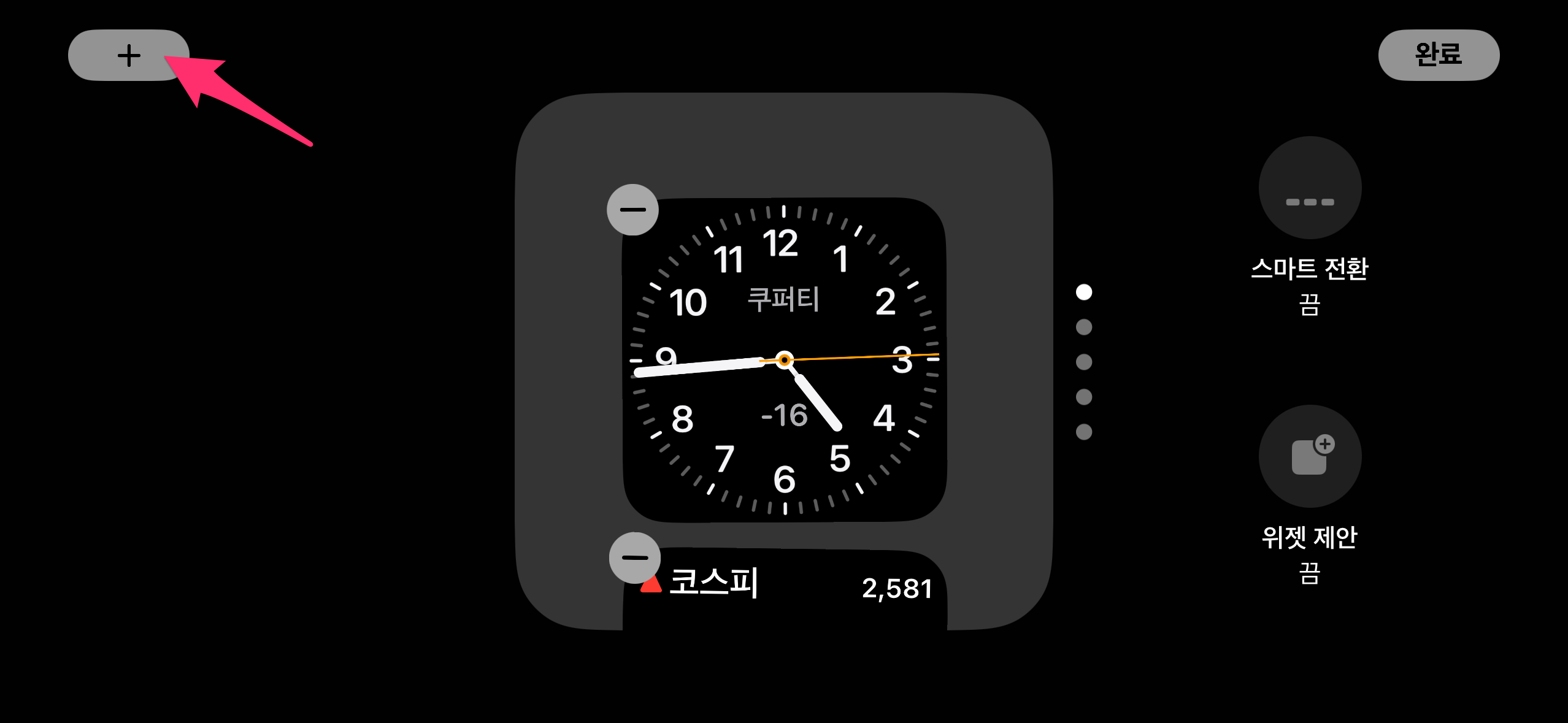 위젯 편집모드에서 왼쪽 상단 + 버튼을 선택합니다.