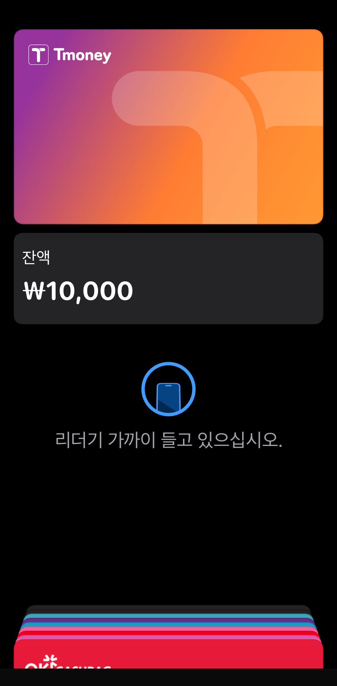 티머니가 익스프레스 모드로 설정되어서 리더기 근처에 갖다 대면 자동으로 작동합니다.