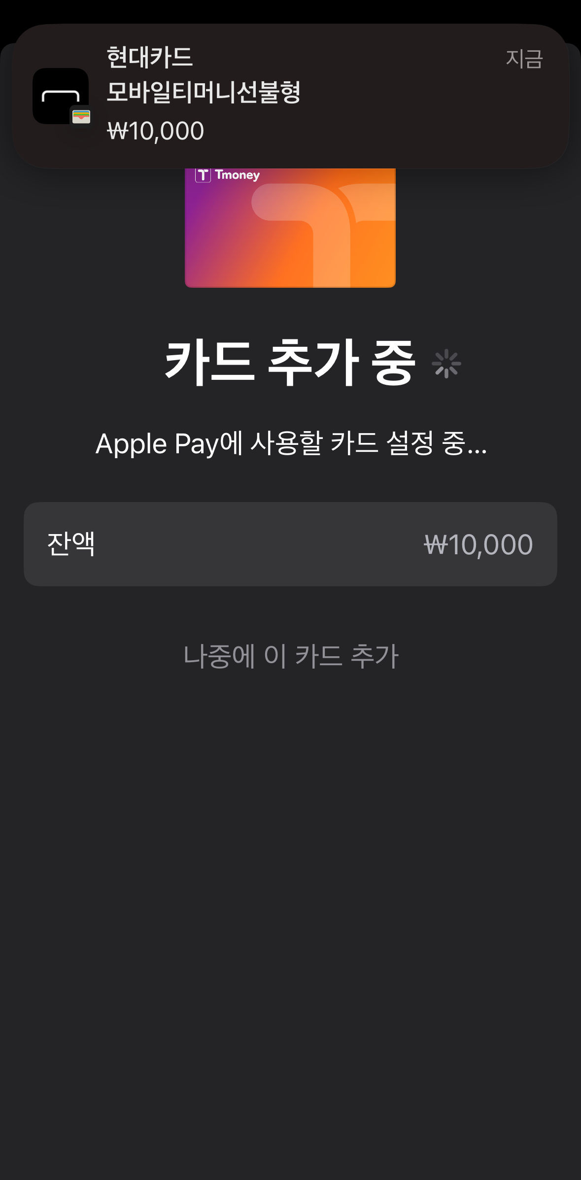 결제는 애플페이로 진행됩니다. 그러면 카드 추가 중이 나옵니다.