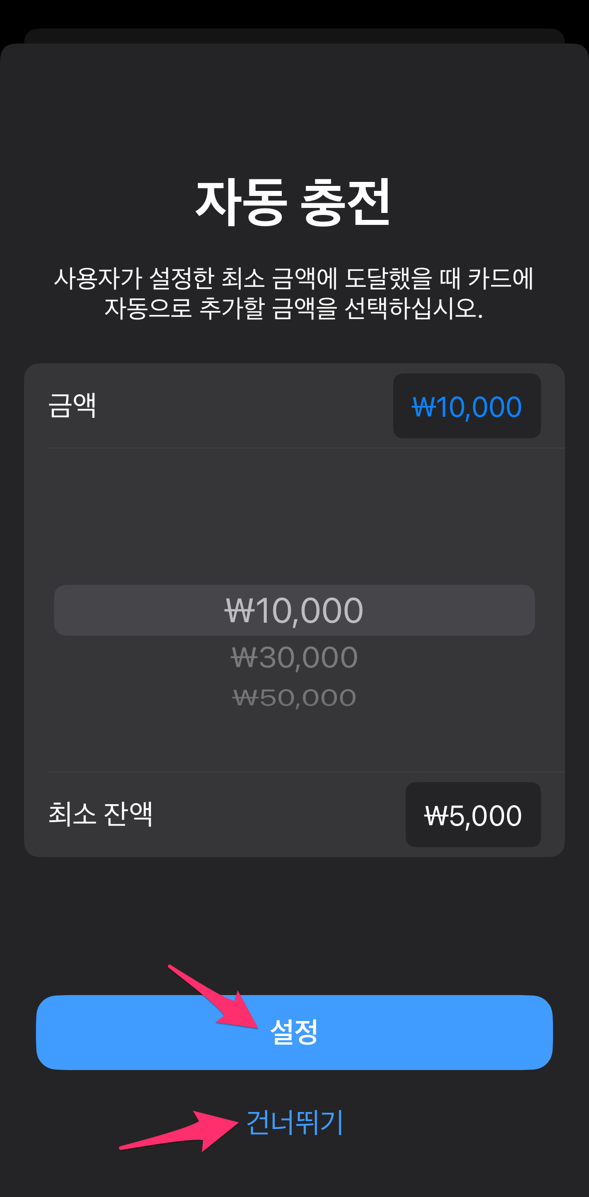 자동충전하셔도 되고 필요할 때마다 일반 충전하시려면 건너뛰기하시면 됩니다.