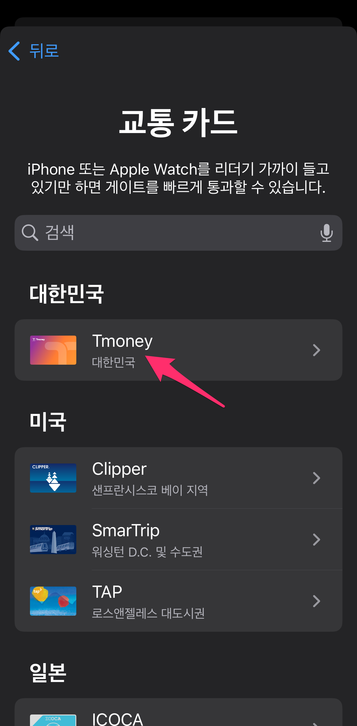교통 카드를 선택하면 대한민국에서 Tmoney 카드를 선택합니다.
