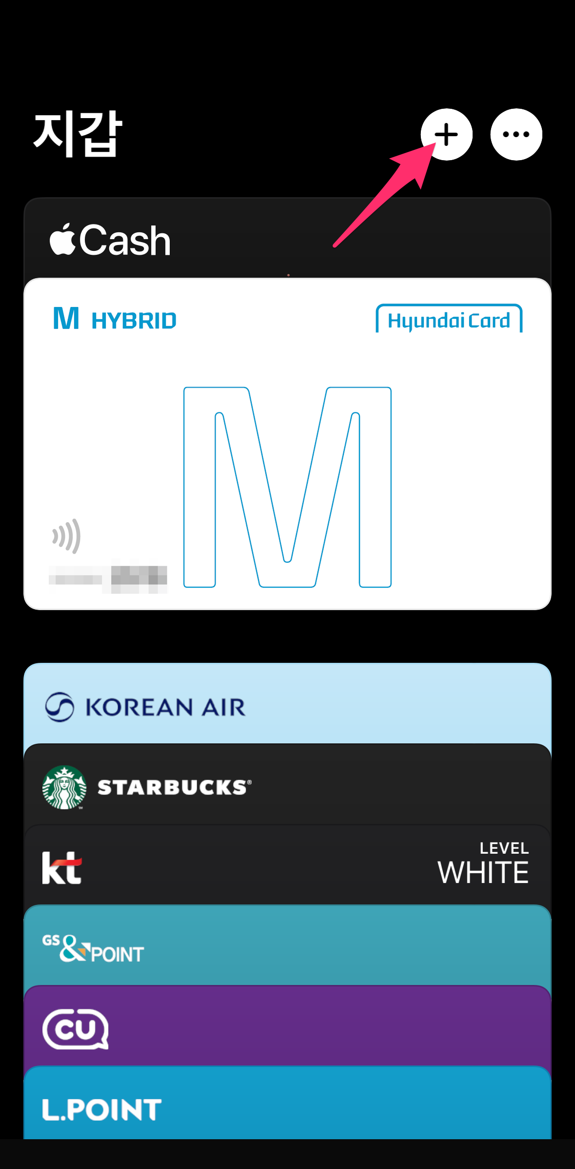우선 아이폰에서 지갑앱을 실행한 후에 오른쪽 상단에 + 버튼을 선택합니다.
