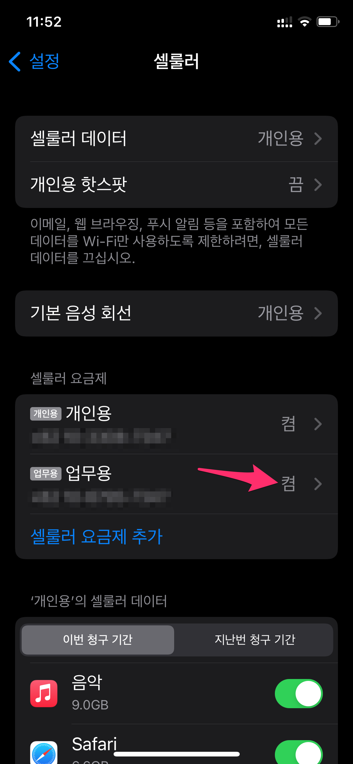 아이폰 [설정] - [셀룰러]에서 추가된 번호를 선택합니다.