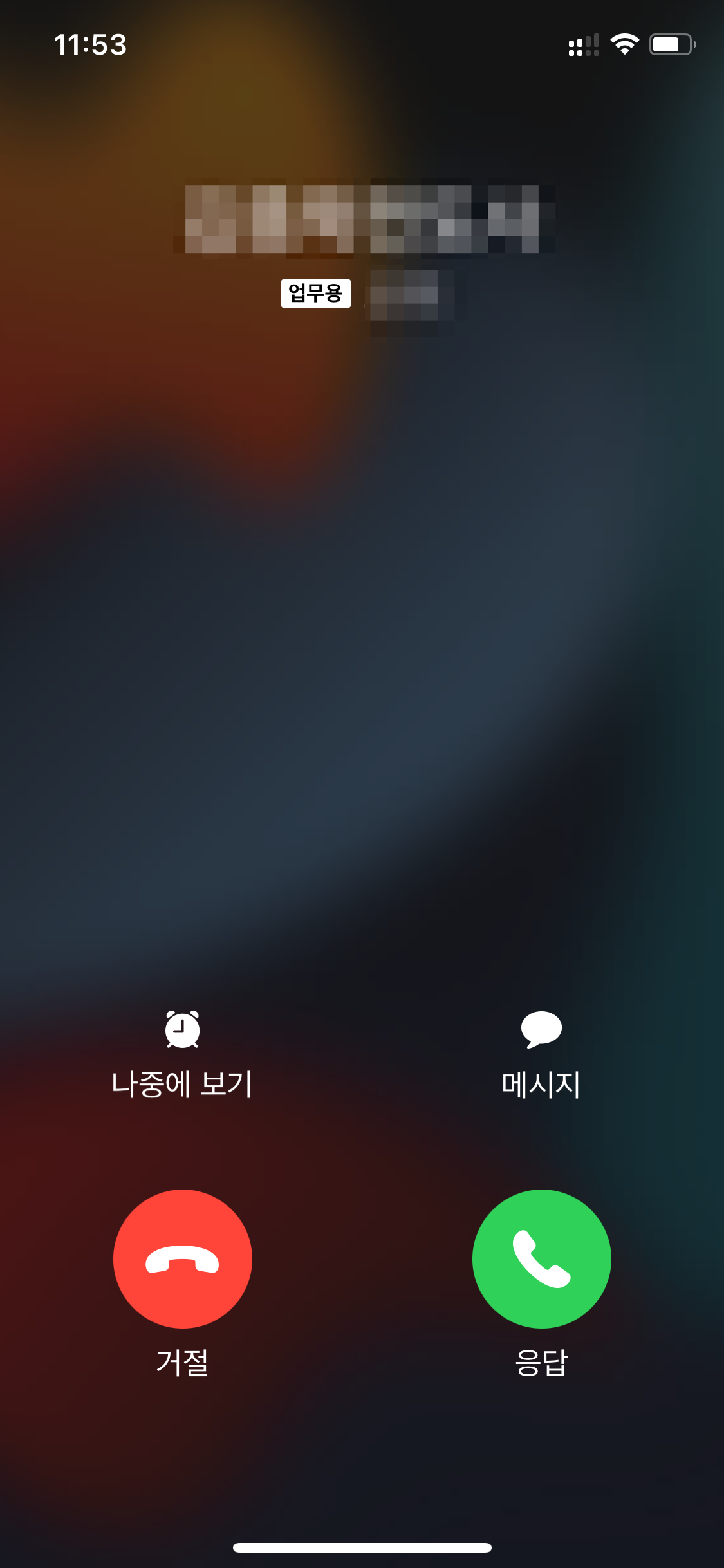 그리고 상대방이 추가한 셀룰러 번호로 전화가 온다면 상단에 이름 밑에 추가된 레이블(업무용)이 보입니다.