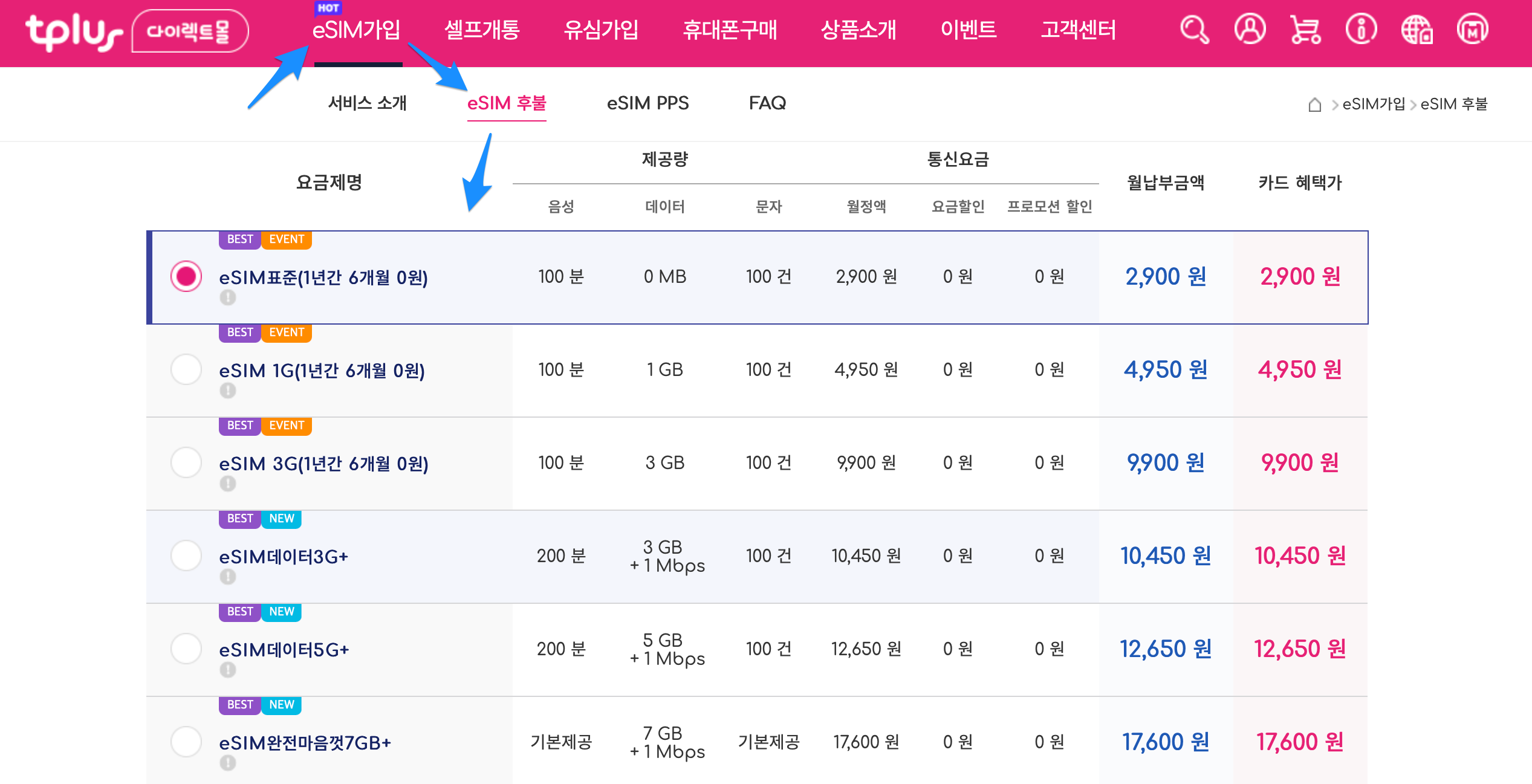 검색창에서 티플러스(https://www.tplusdirectmall.com)로 접속하고 회원 가입하신 후에 [eSIM] - [eSIM 후불] 페이지를 들어가시면 가입할 수 있는 페이지가 나옵니다.