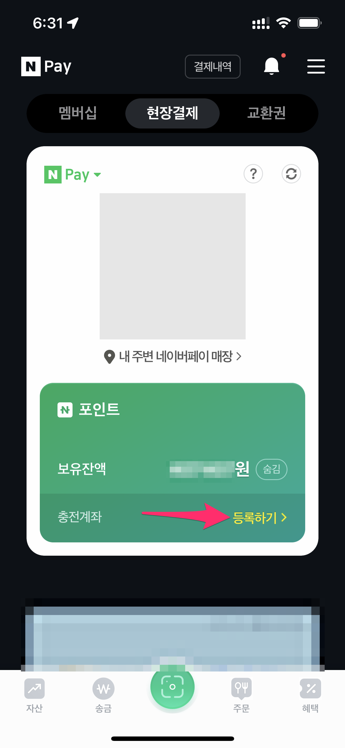 아이폰에서 네이버페이를 실행하고 충전 계좌 옆에 등록하기를 선택합니다.