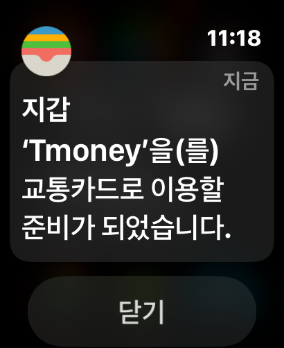 애플워치에서 이렇게 알림 메시지가 나오고 애플워치 지갑앱을 열면 티머니 카드를 확인할 수 있습니다.