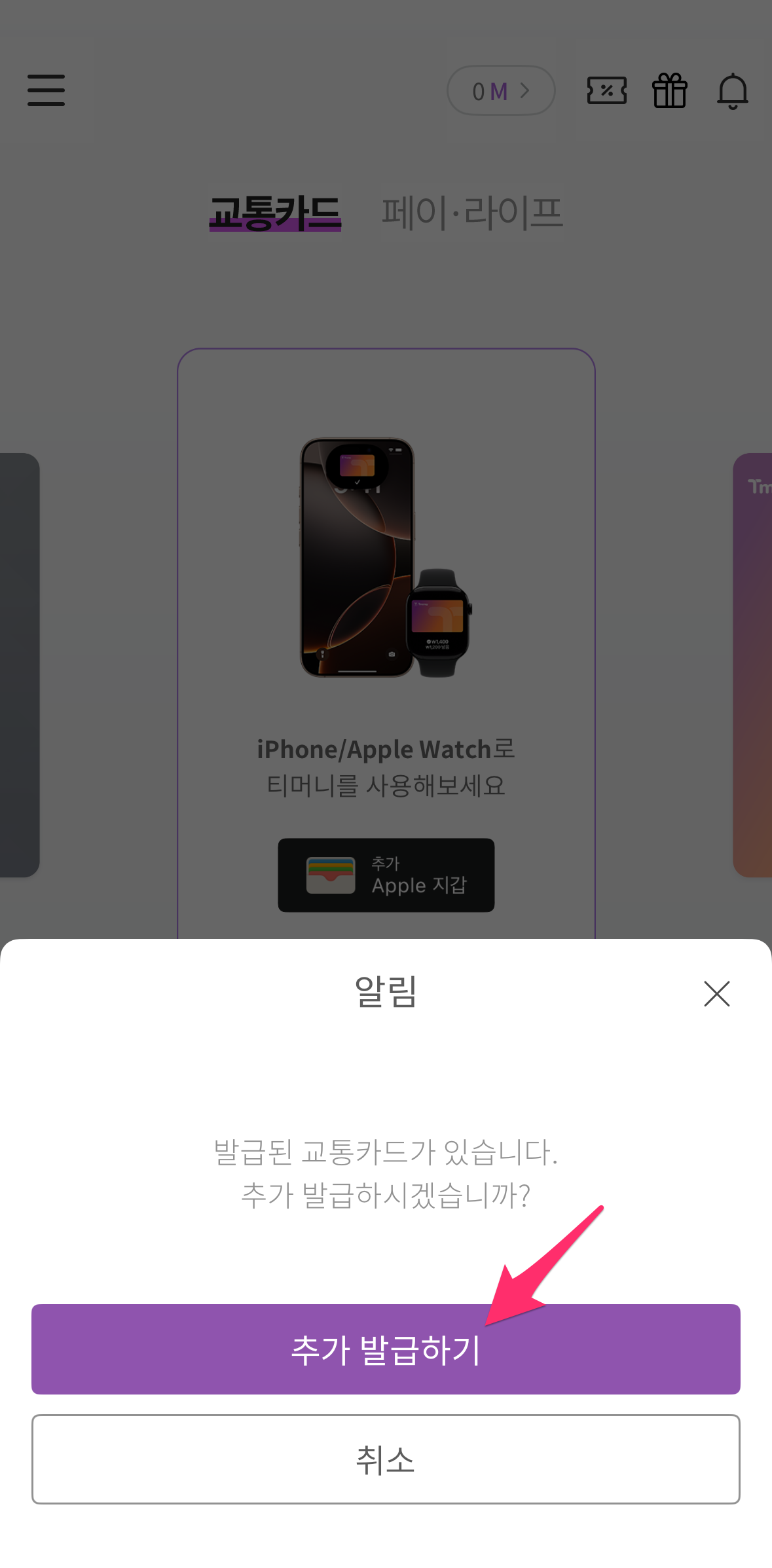 저렇게 추가 발급하기로 나오는 것은 제가 방금 전에 아이폰에 티머니 카드를 추가했기 때문입니다.