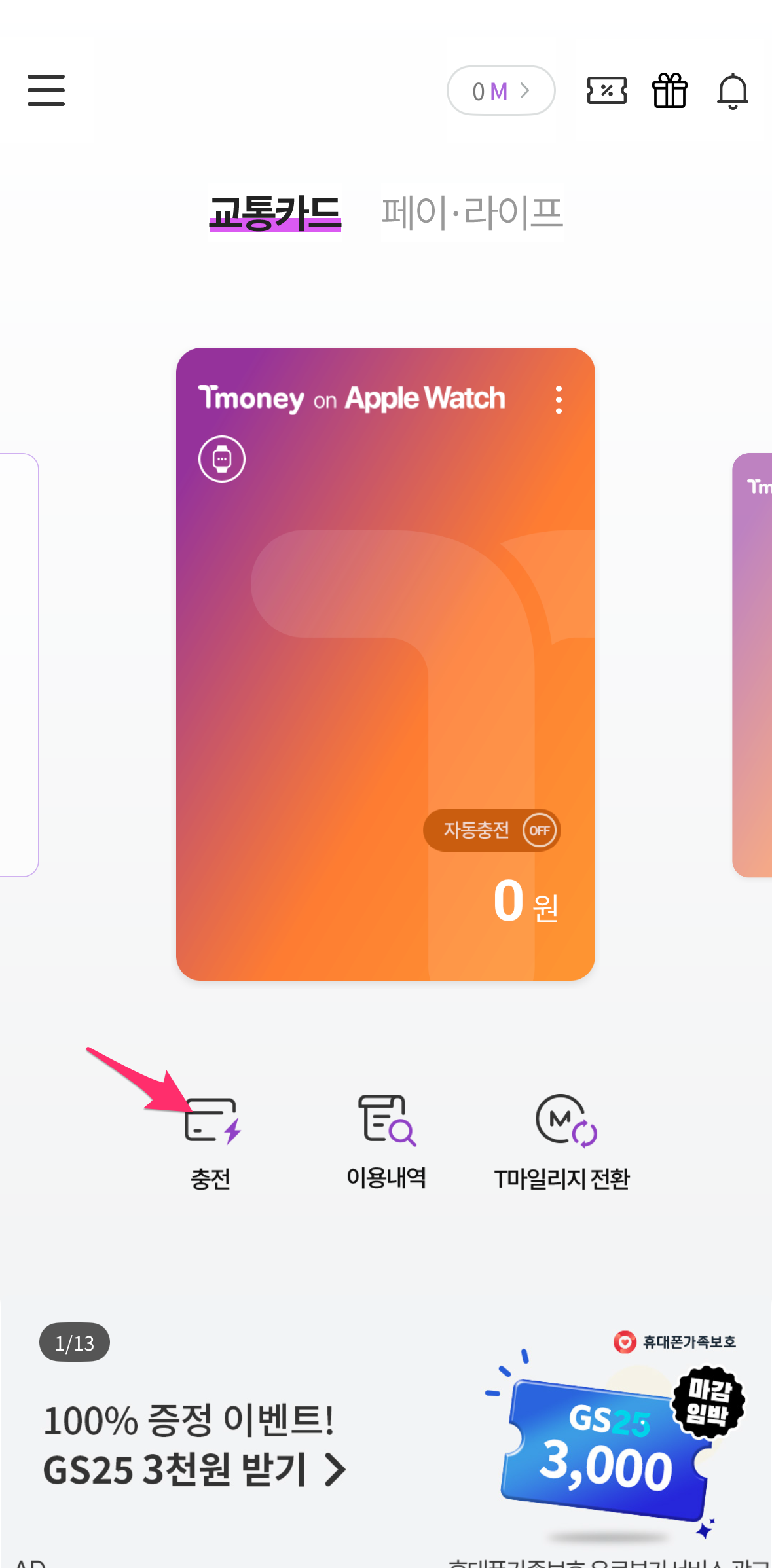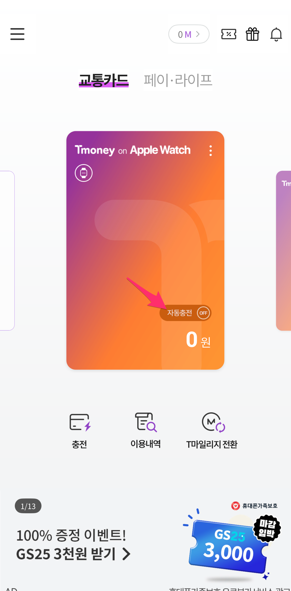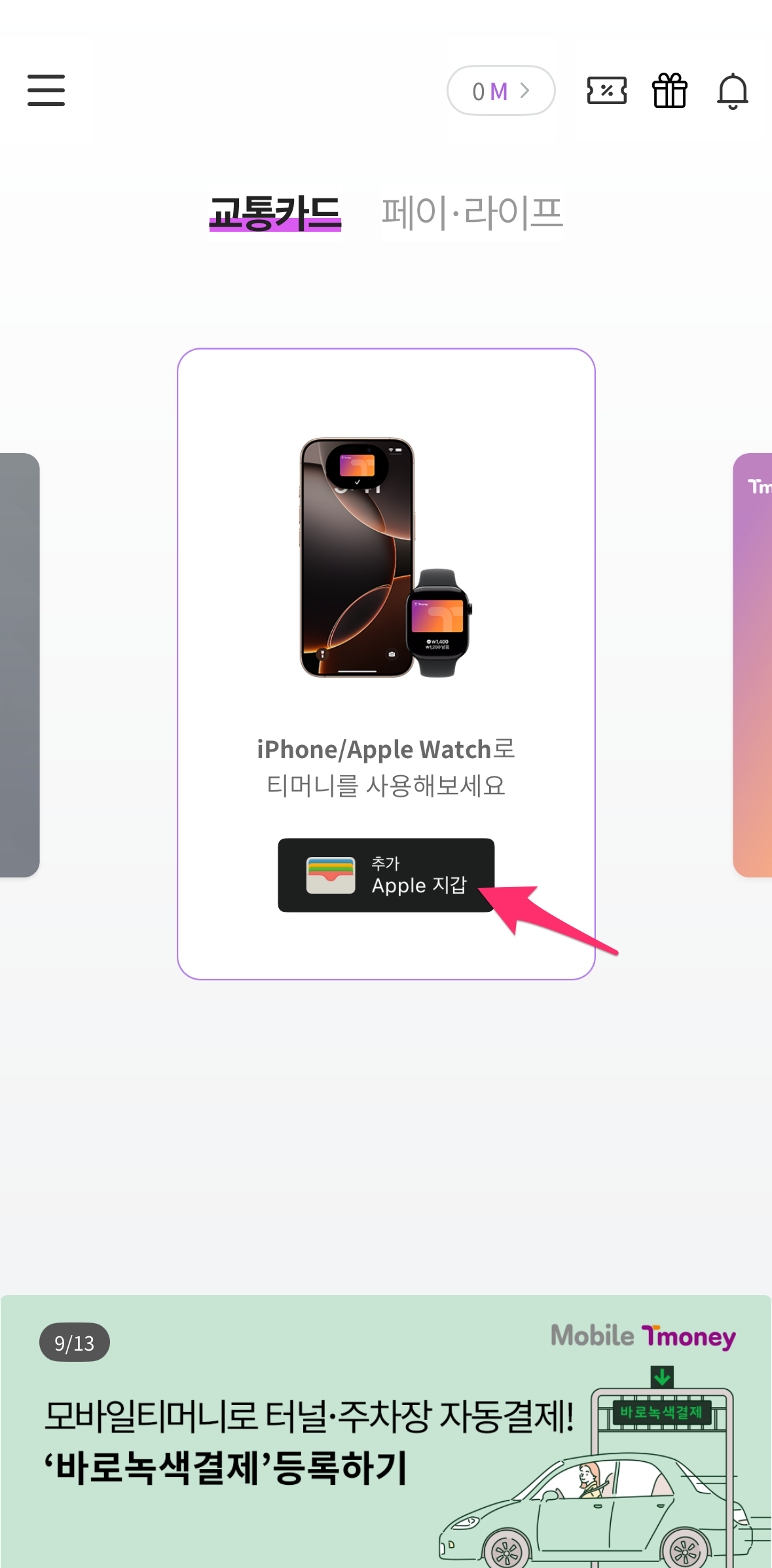 iPhone/Apple Watch 티머니 배너를 선택하시면 됩니다.