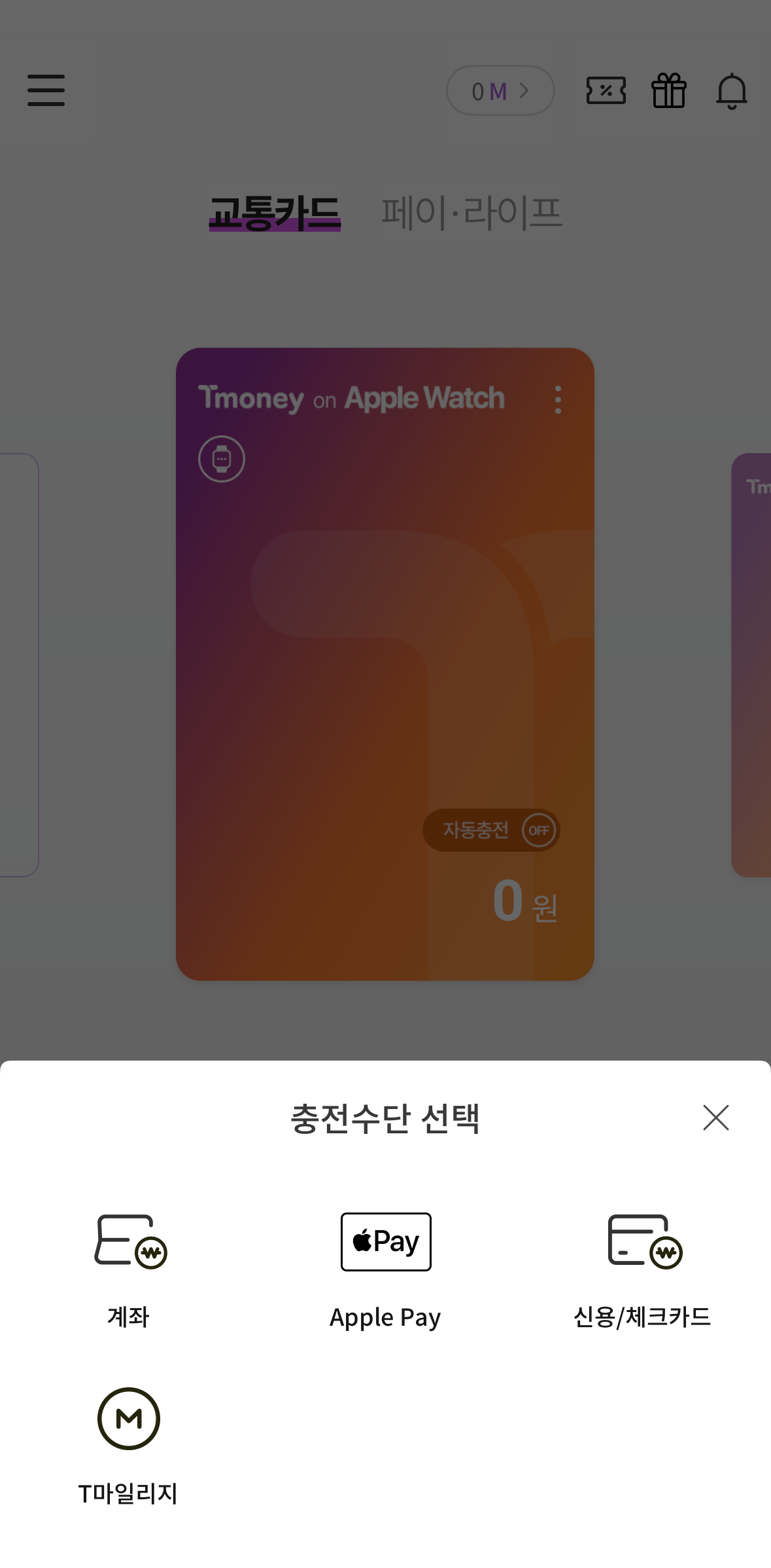 일반 충전은 계좌, 애플페이, 신용/체크카드, T마일리지로 가능합니다.