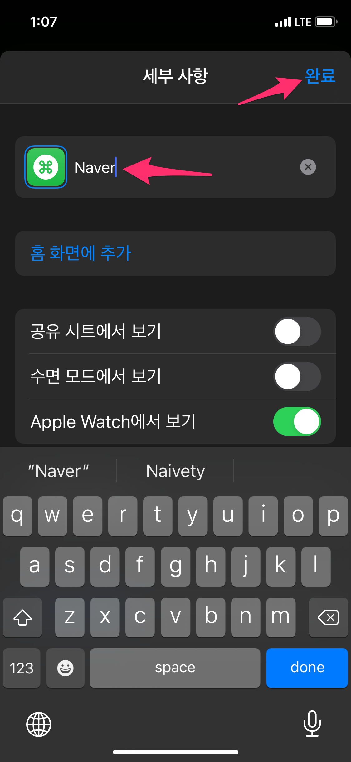 단축어에서 방금 생성한 Naver 단축어를 선택하면 컴플리케이션이 변경된 것을 확인합니다.