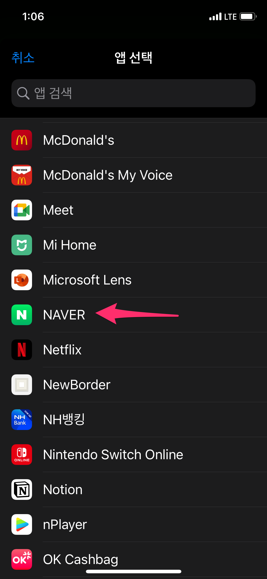 앱을 선택하시는 분이 계시는데 거기에는 Naver가 안 보입니다.
