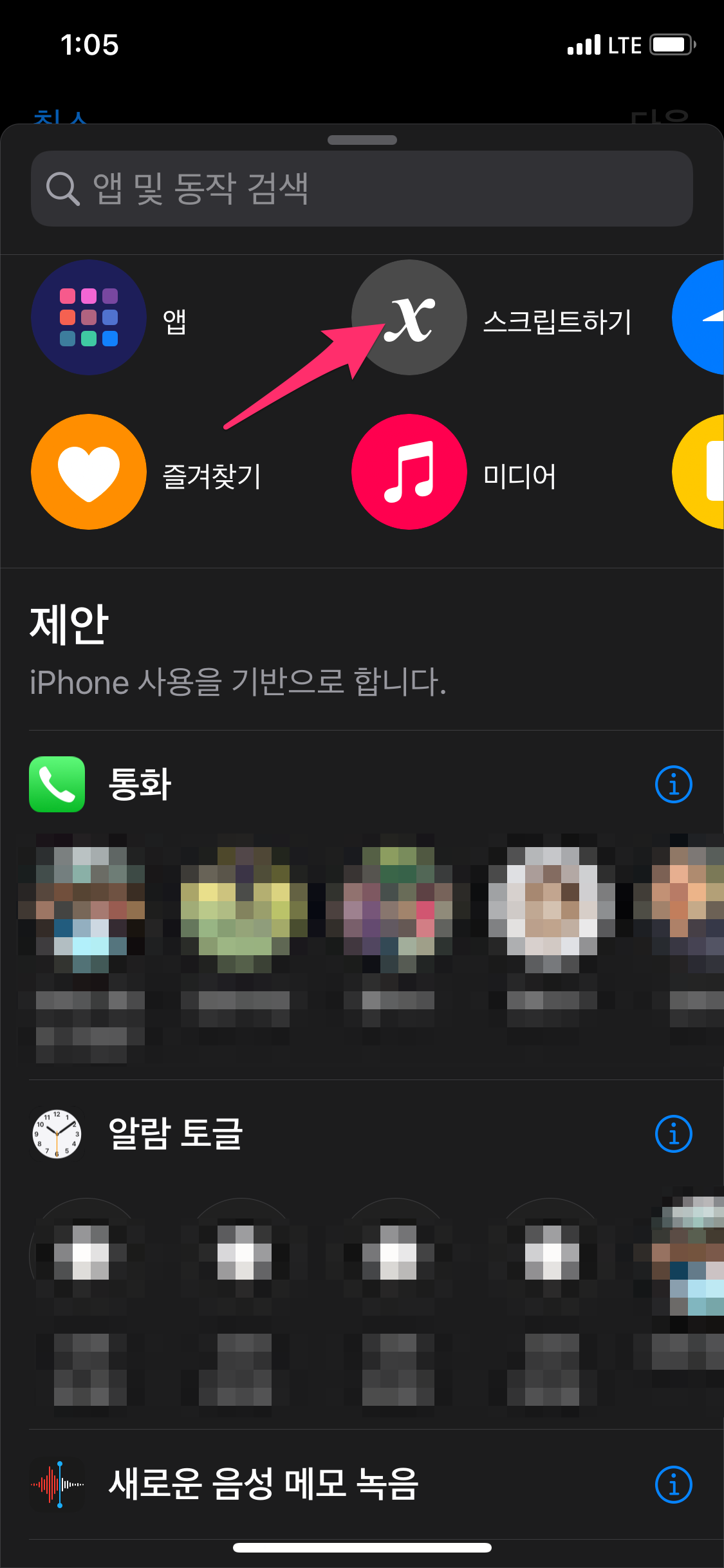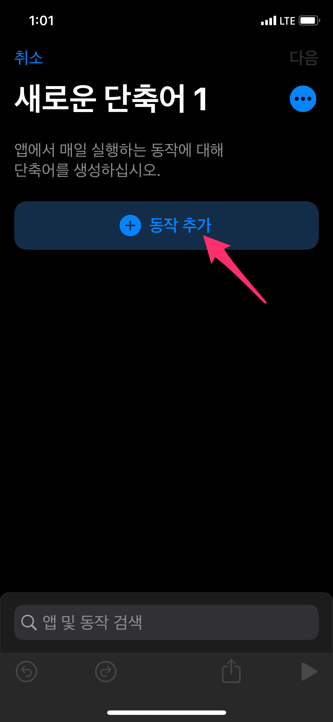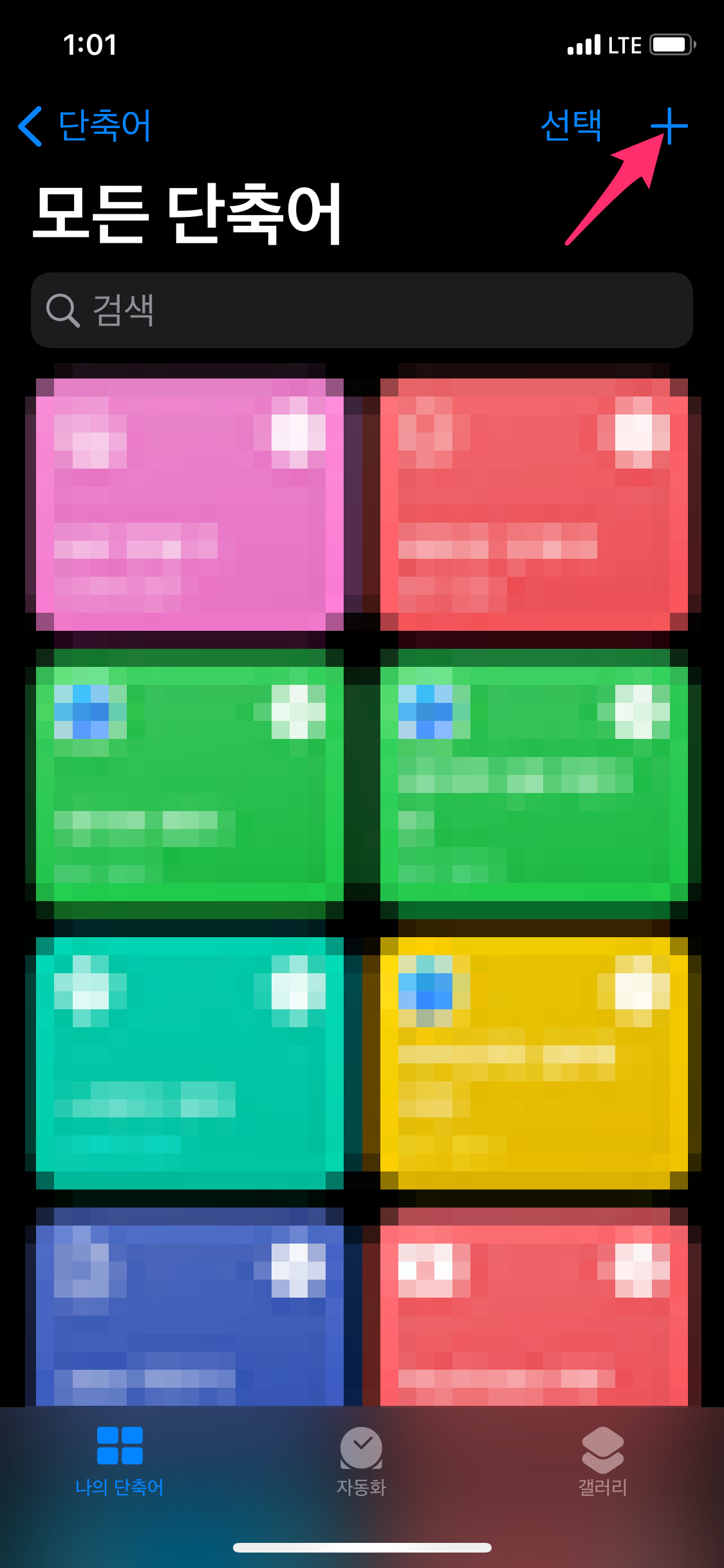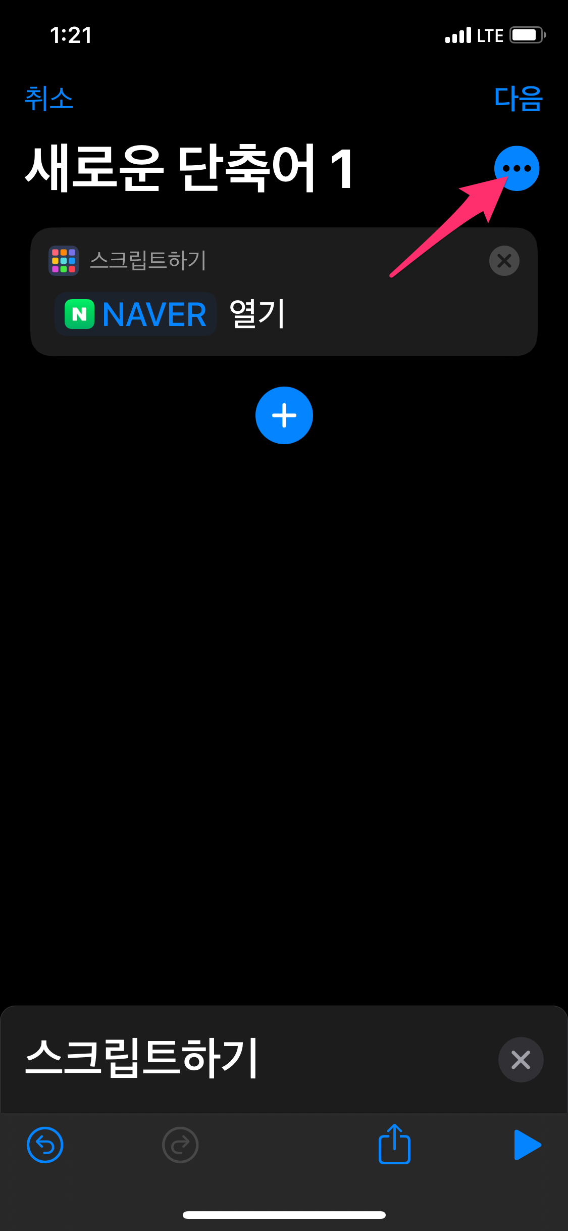 아이폰에서 단축어 앱을 실행하고 단축어 앱에서 오른쪽 상단에 있는 + 버튼을 선택합니다.