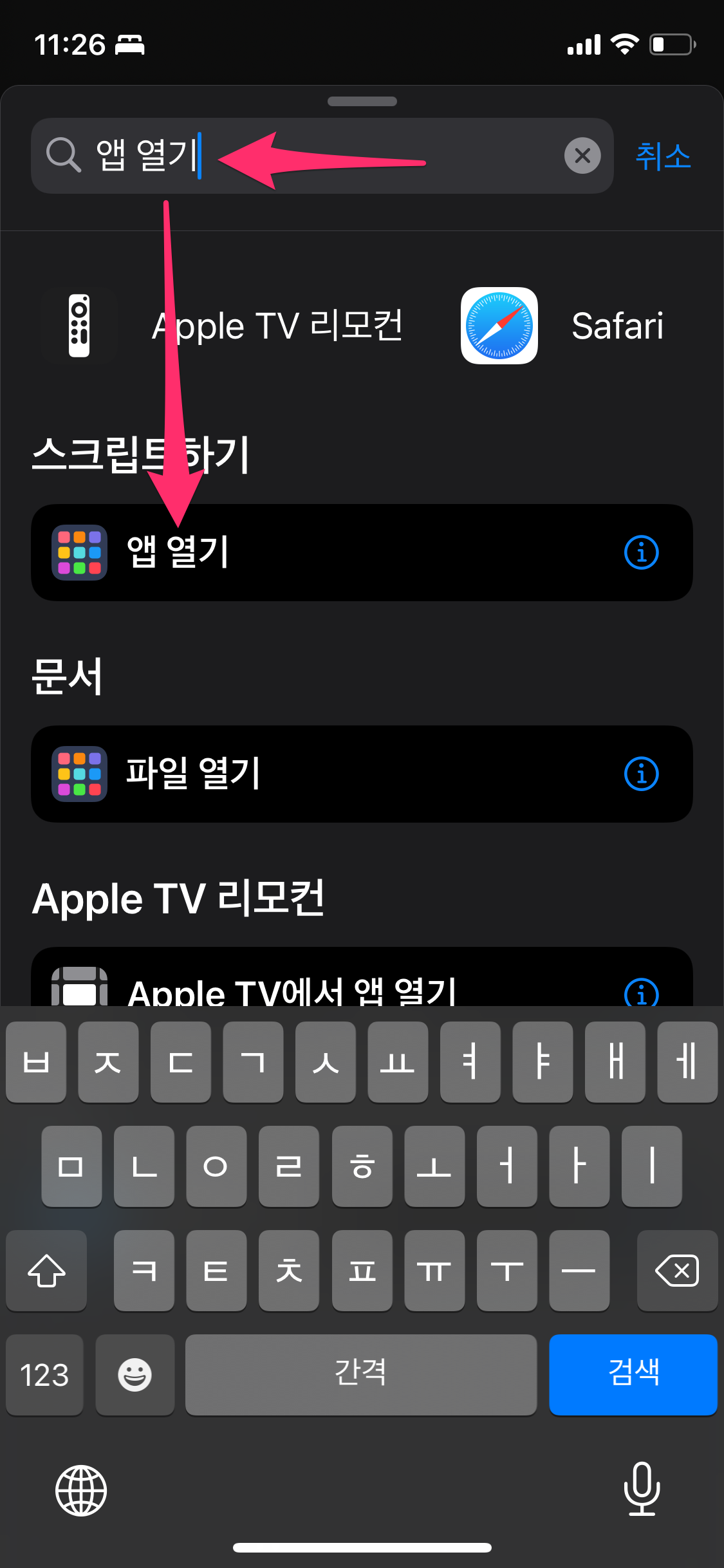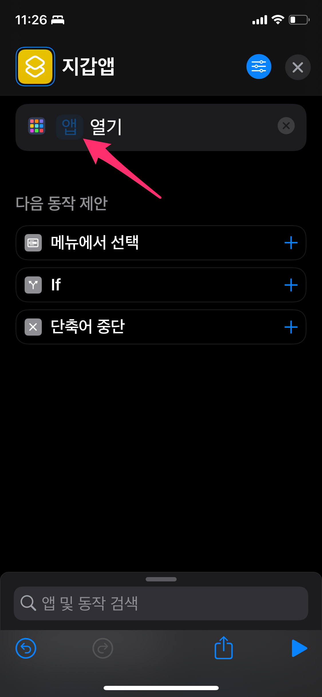 동작 목록에 검색 창에 앱 열기로 검색한 후에 앱 열기를 선택합니다.