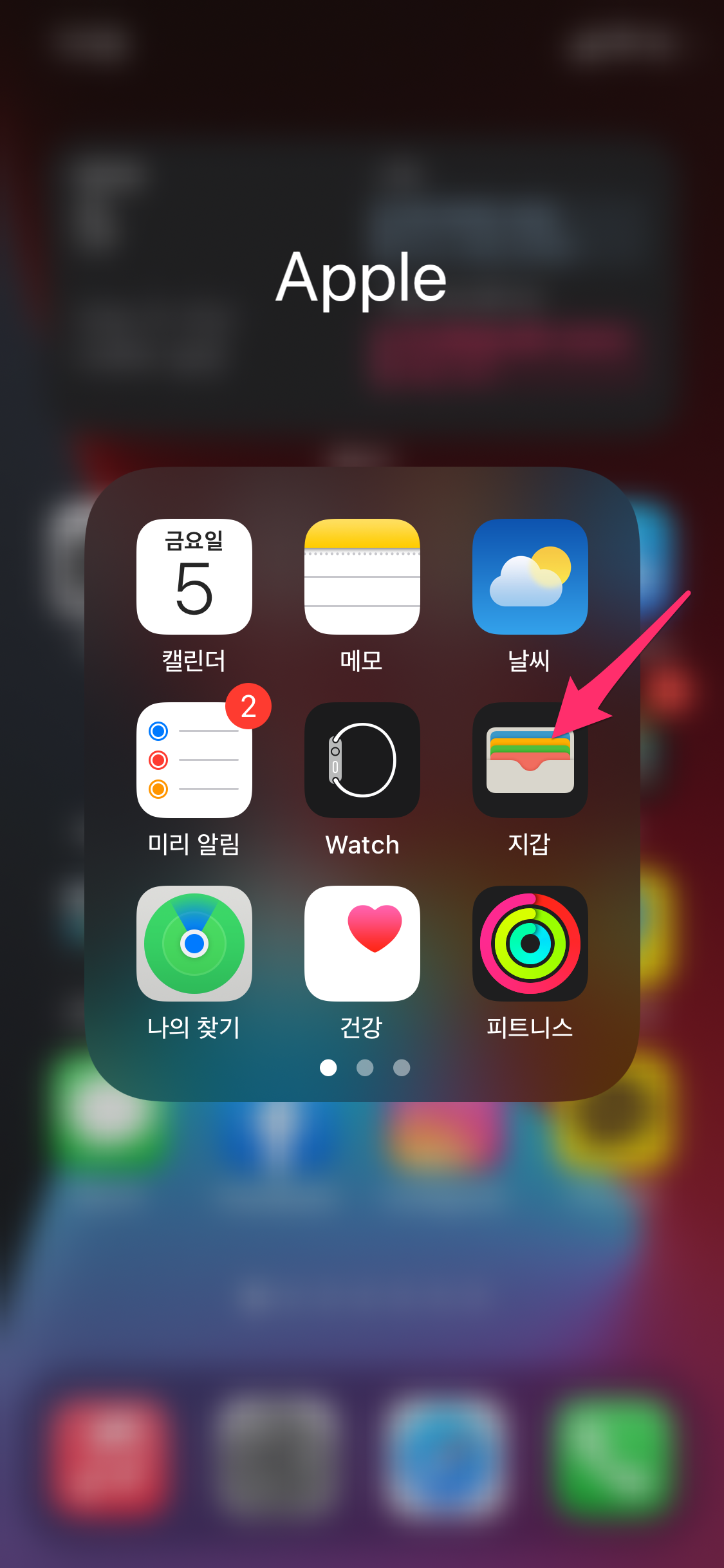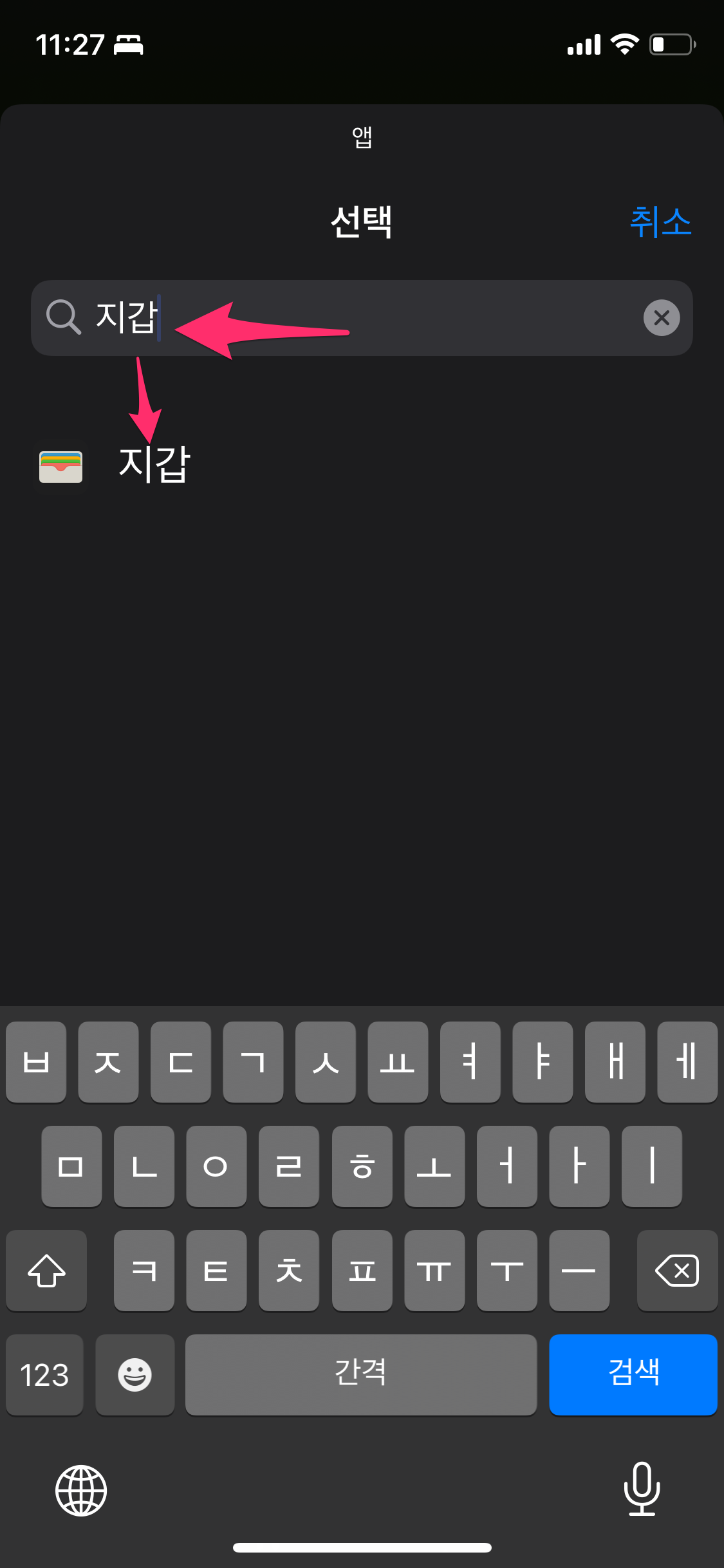 파란색 글씨의 앱을 선택한 후에 앱 목록에서 지갑을 검색하여 선택합니다.