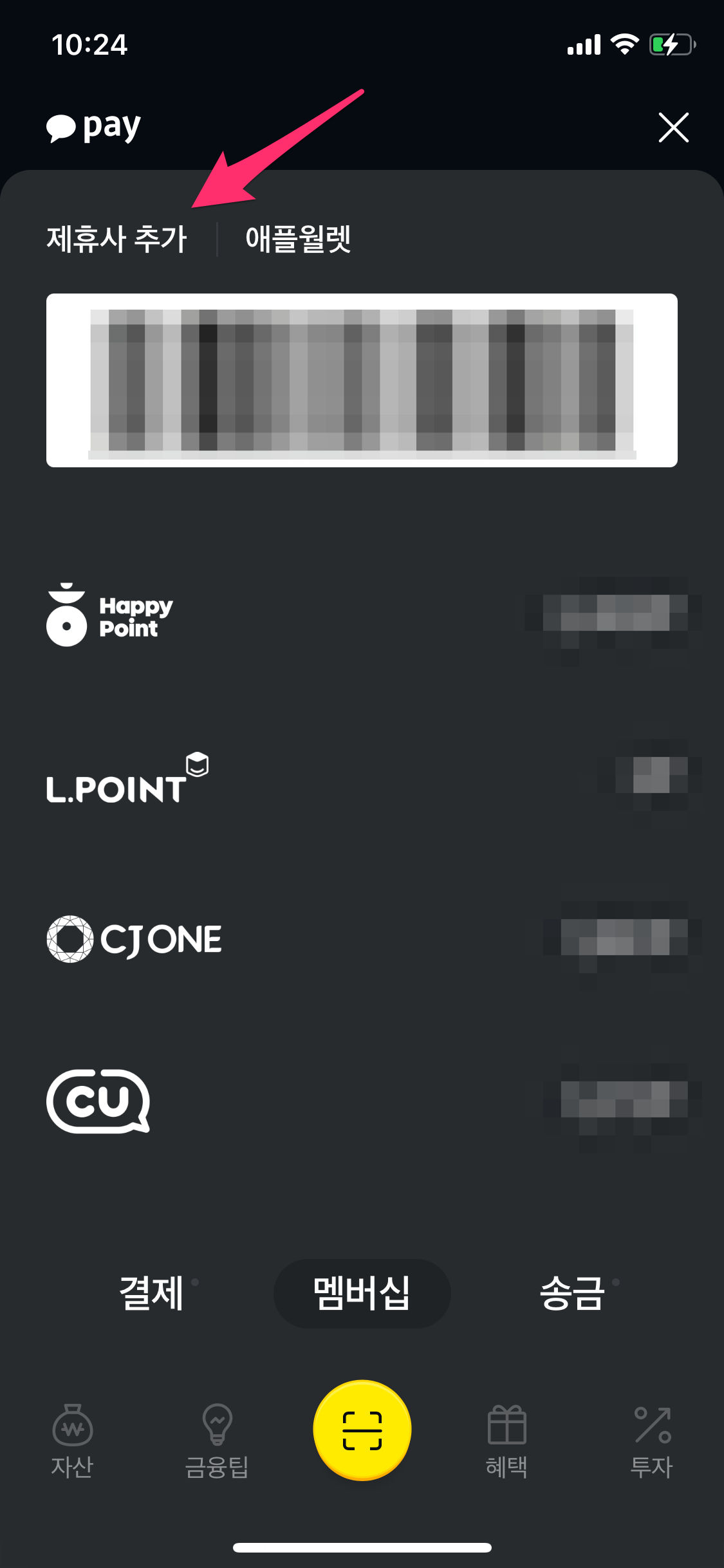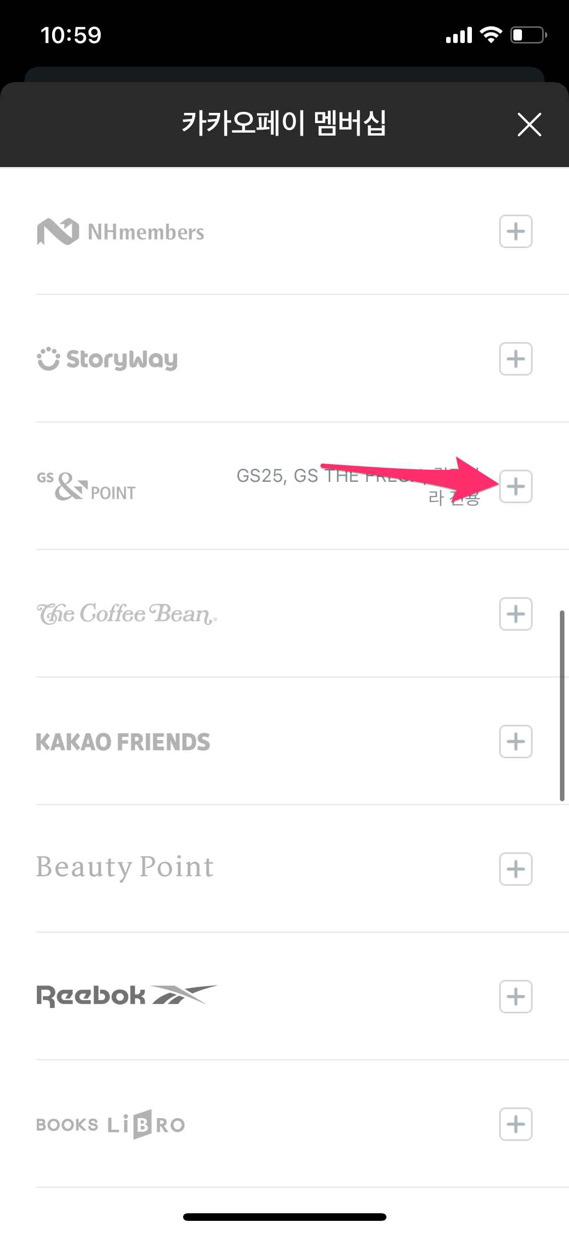 등록이 안된 멤버십 목록이 나오고 원하는 멤버십 오른쪽에 + 버튼을 선택하여 안내에 따라 등록합니다.