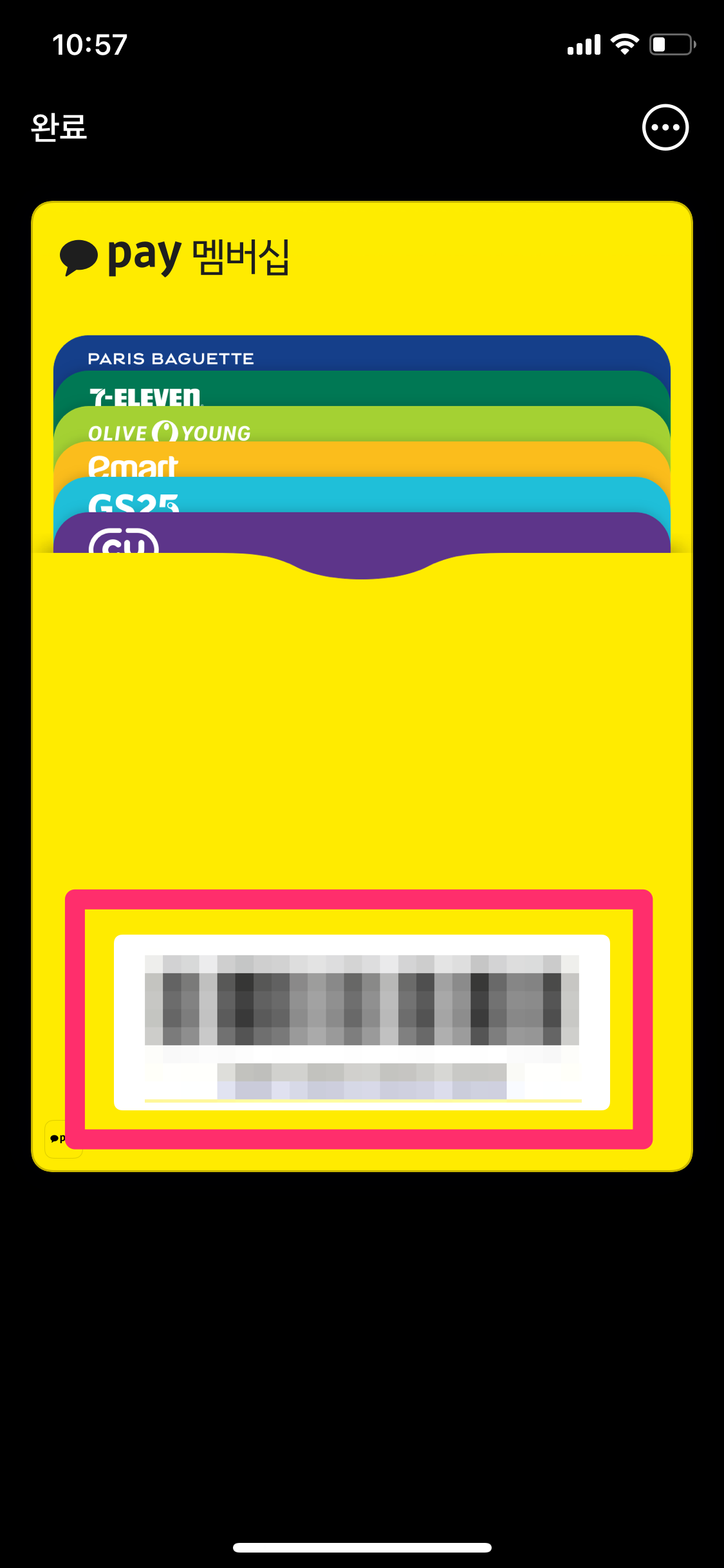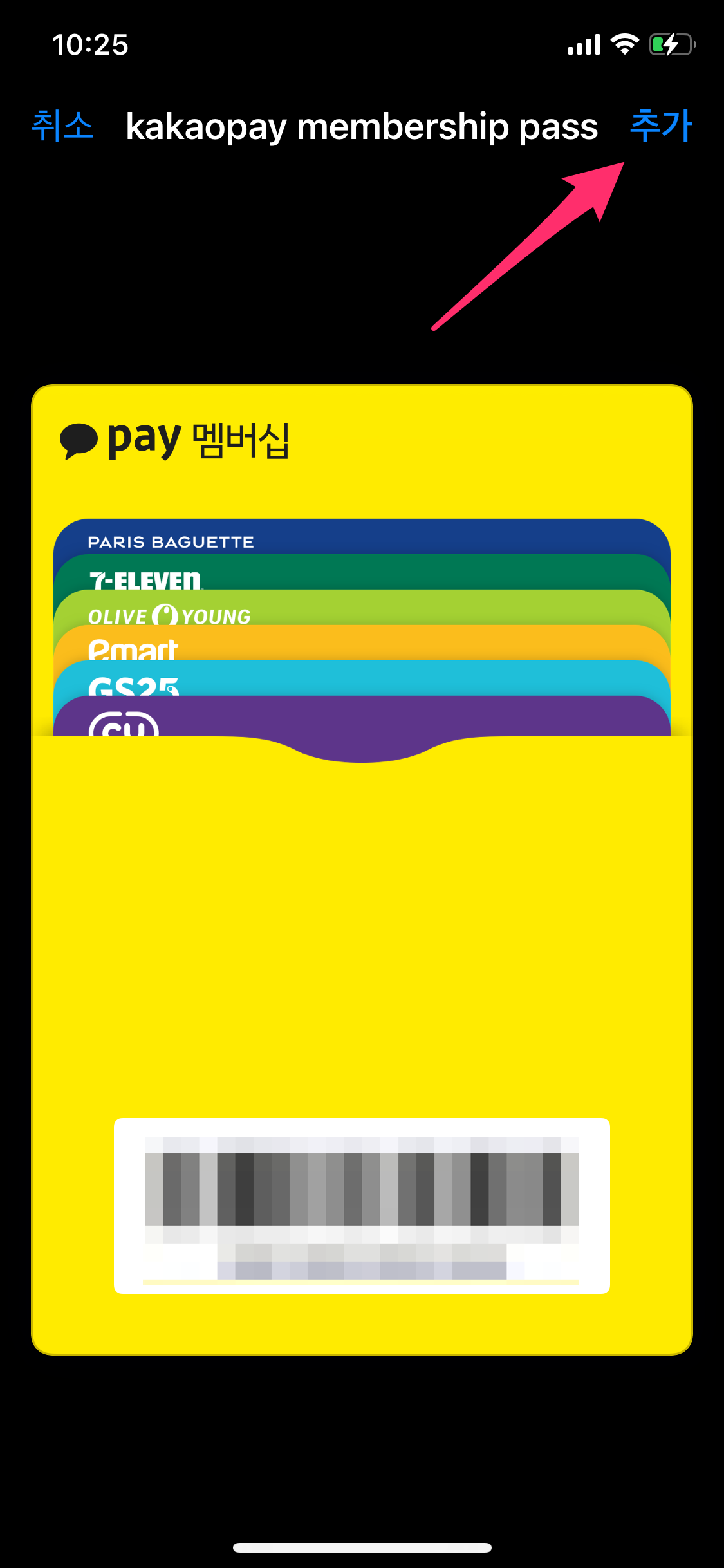 방금 전에 카카오페이 멤버십에 등록한 멤버십 서비스를 바코드 하나로 쉽게 적립할 수 있습니다.