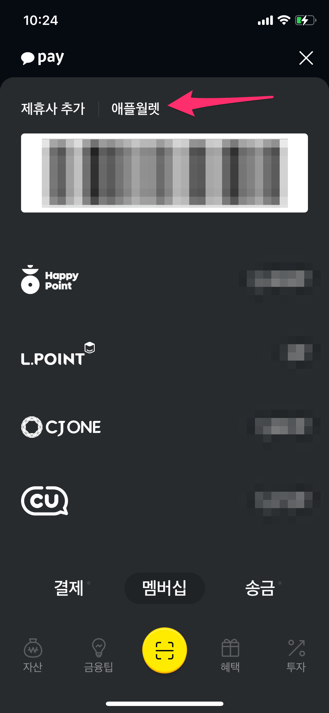이제 지갑앱을 선택하면 방금 등록한 카카오페이 멤버십을 선택합니다.