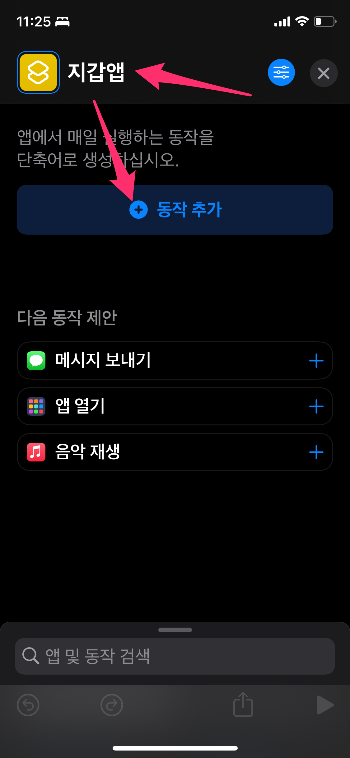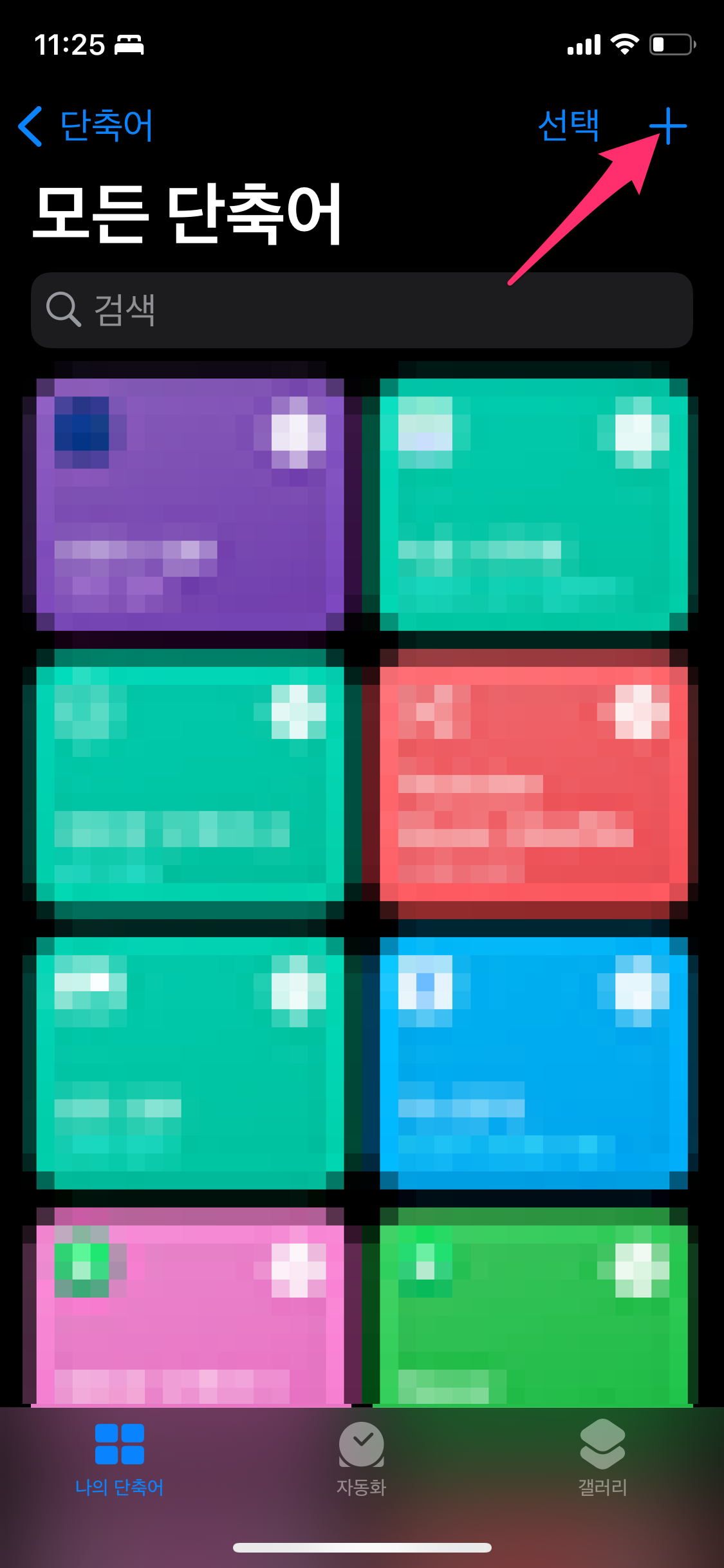 우선 단축어를 실행하고 오른쪽 상단에 + (추가) 버튼을 선택합니다.