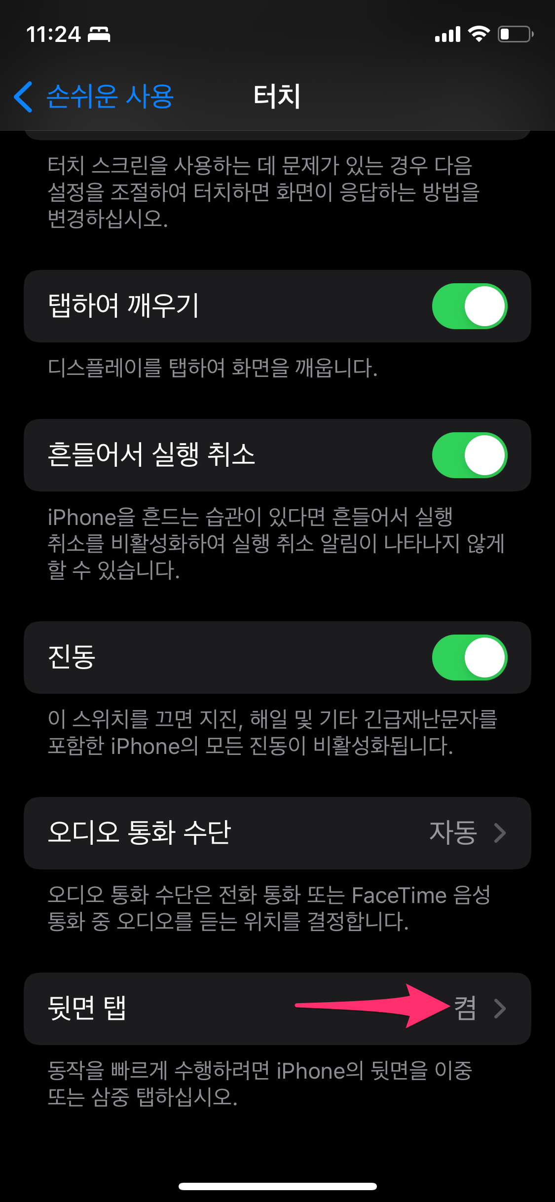 터치를 선택하고 제일 하단에 뒷면 탭을 선택합니다.