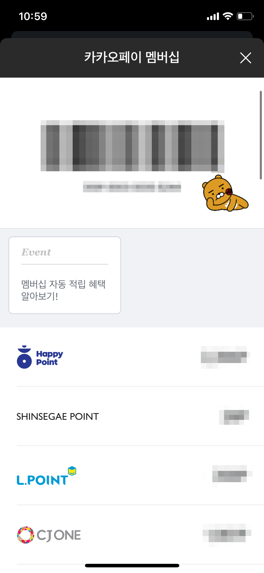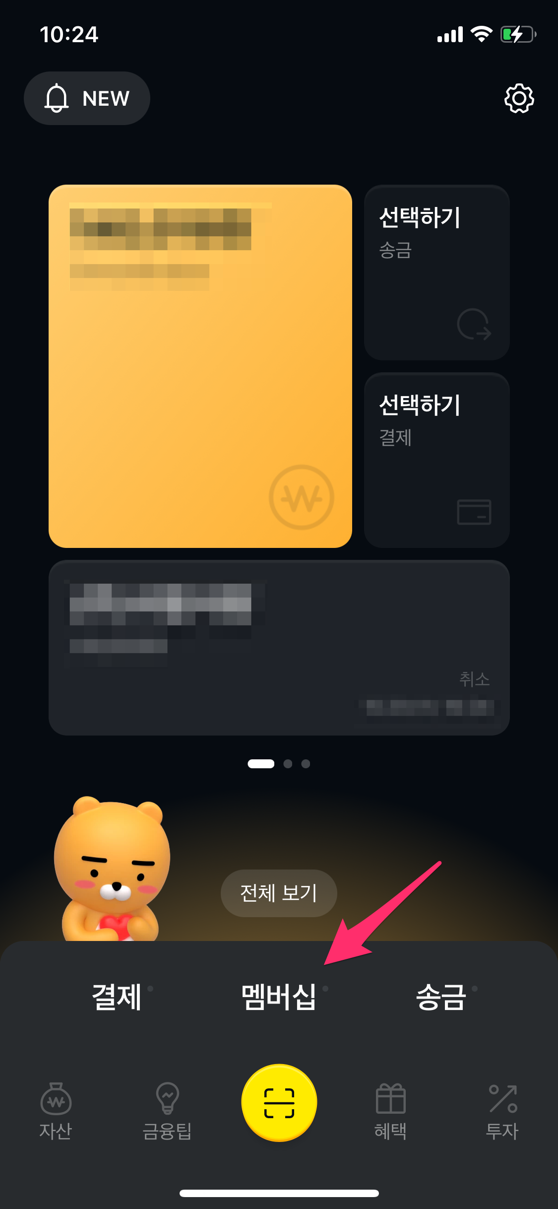 카카오페이에 들어와서 하단 가운데 멤버십을 선택합니다.