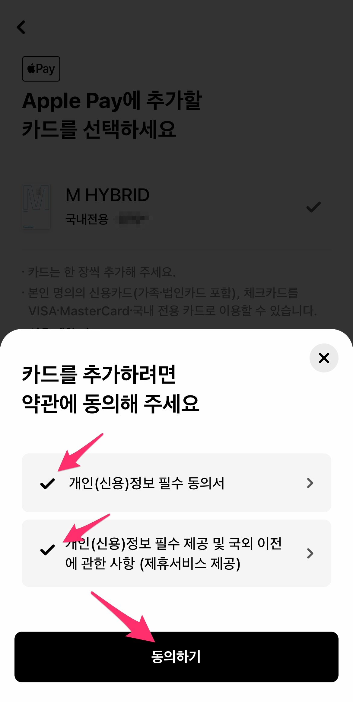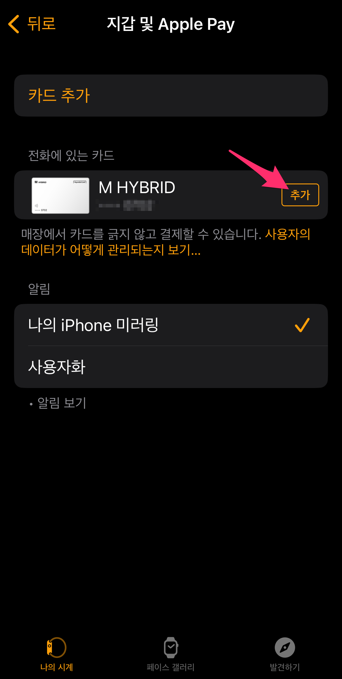 저는 M HYBRID를 선택하고 하단에 Apple 지갑에 추가 버튼을 선택합니다.