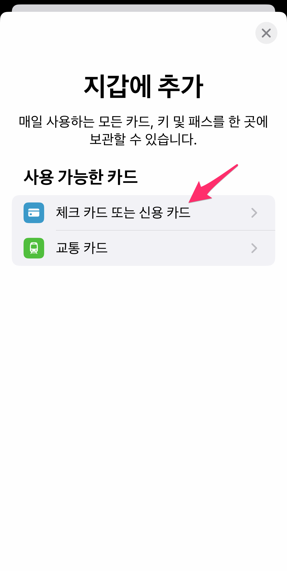 지갑에 추가에서 사용 가능한 카드 중에서 체크 카드 또는 신용 카드를 선택합니다.