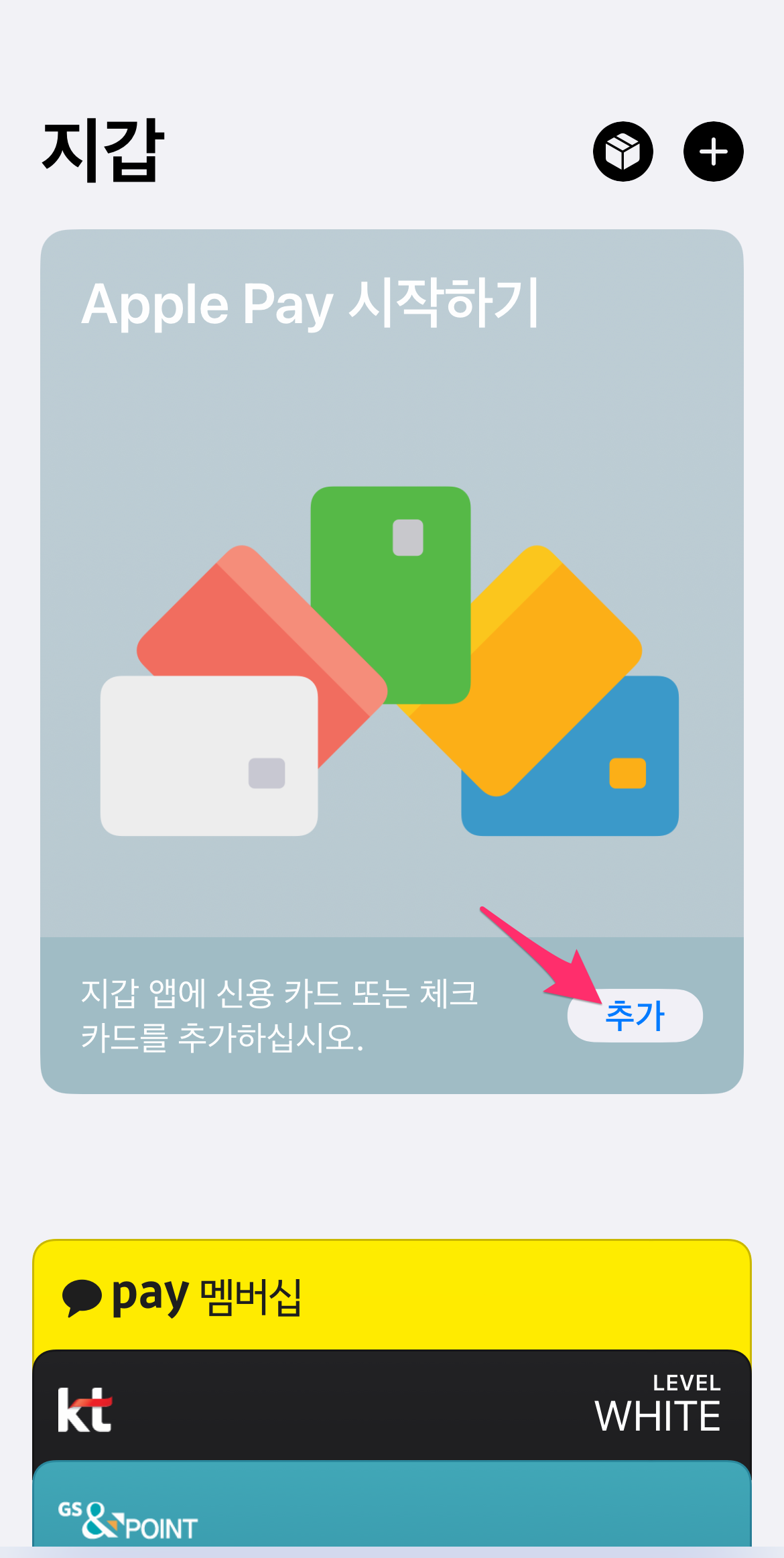 지갑 및 Apple Pay에서 전화에 있는 카드를 추가합니다.