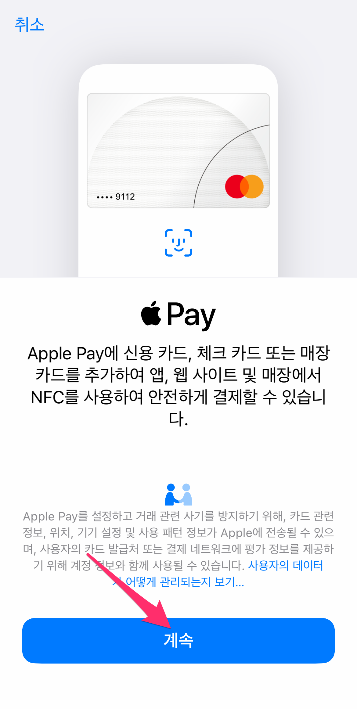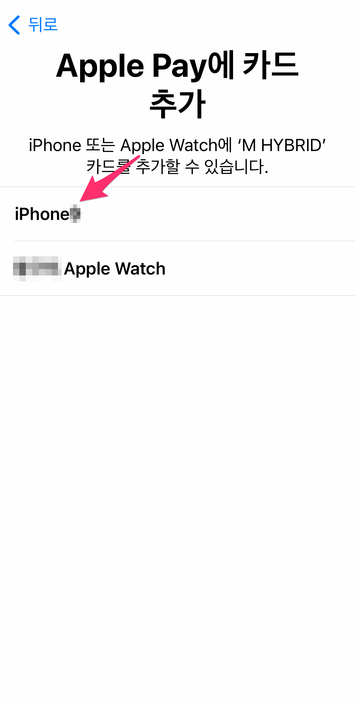 동의가 마치고 계속을 선택하면 Apple Pay에 카드 추가에서 iPhone를 선택합니다.